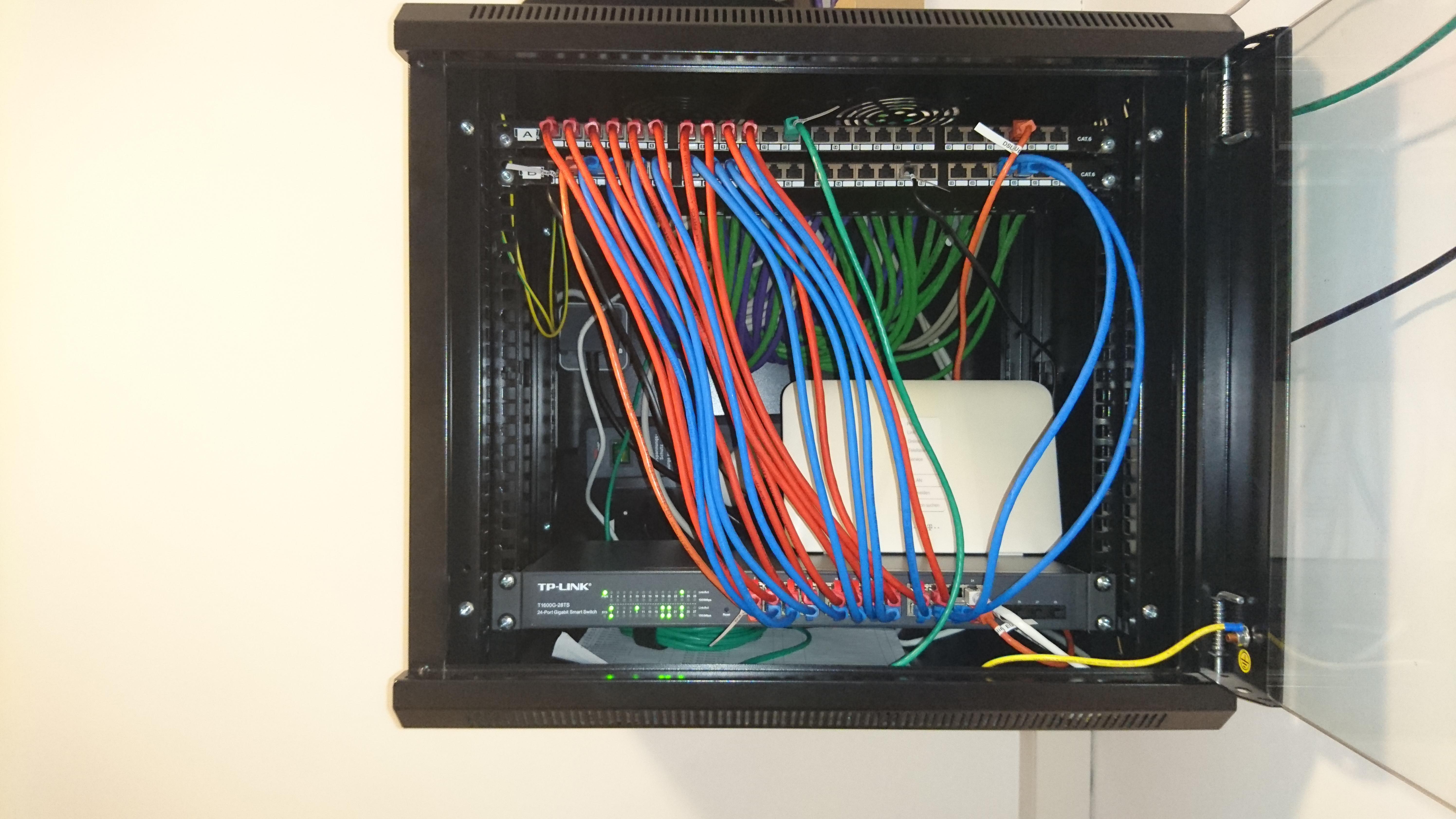 1. Ist der Schrank nicht etwas überdimensioniert? Brauchst du 12 HE? Was soll da alles rein? Ich habe einen mit 9 HE und da sind zwei Patchpanel und ein Switch drin, auf dem der Router steht.