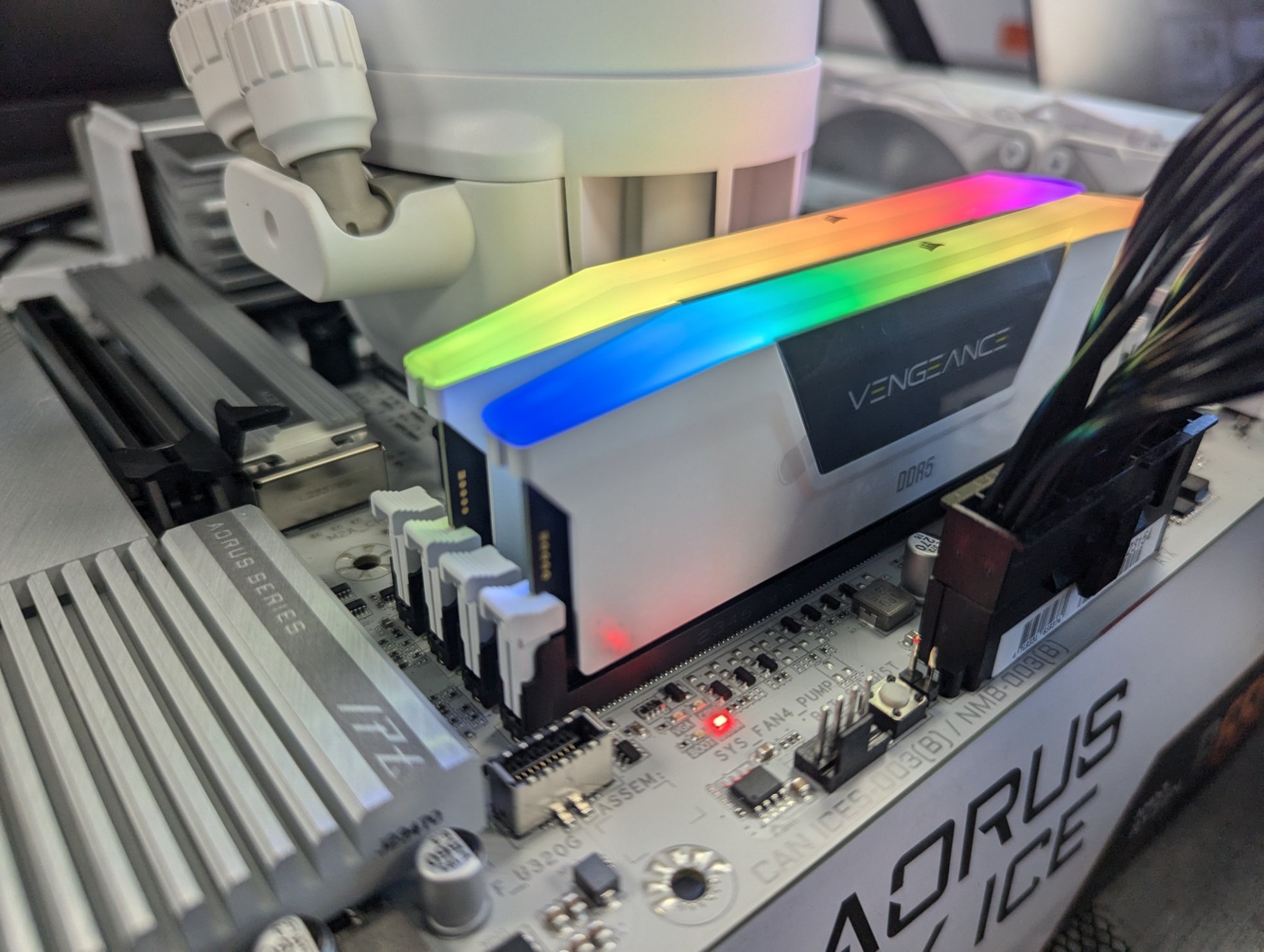 - Arbeitsspeicher (RAM): 32GB Corsair Vengeance RGB weiß DDR5-6000 DIMM CL36 Dual Kit