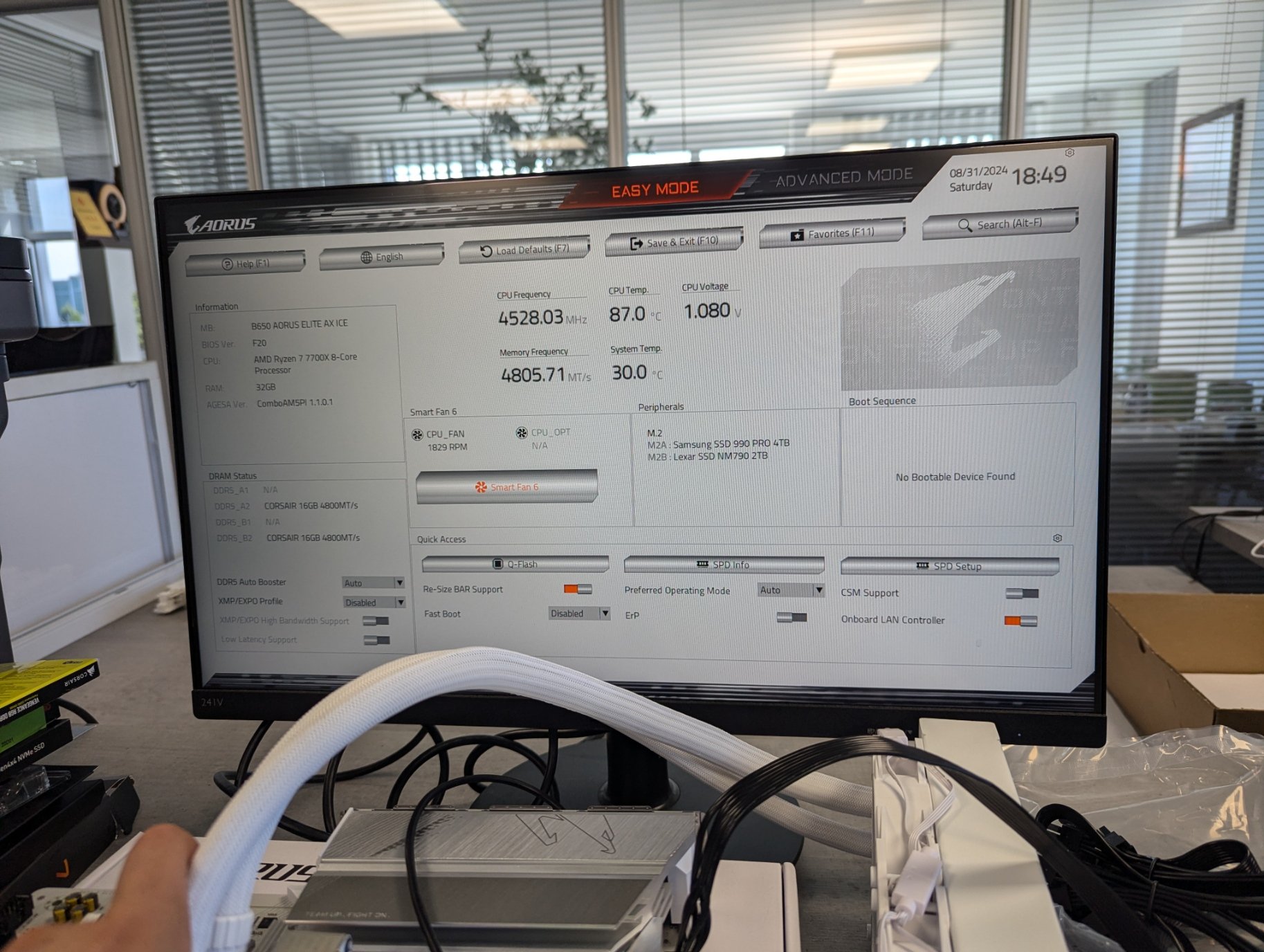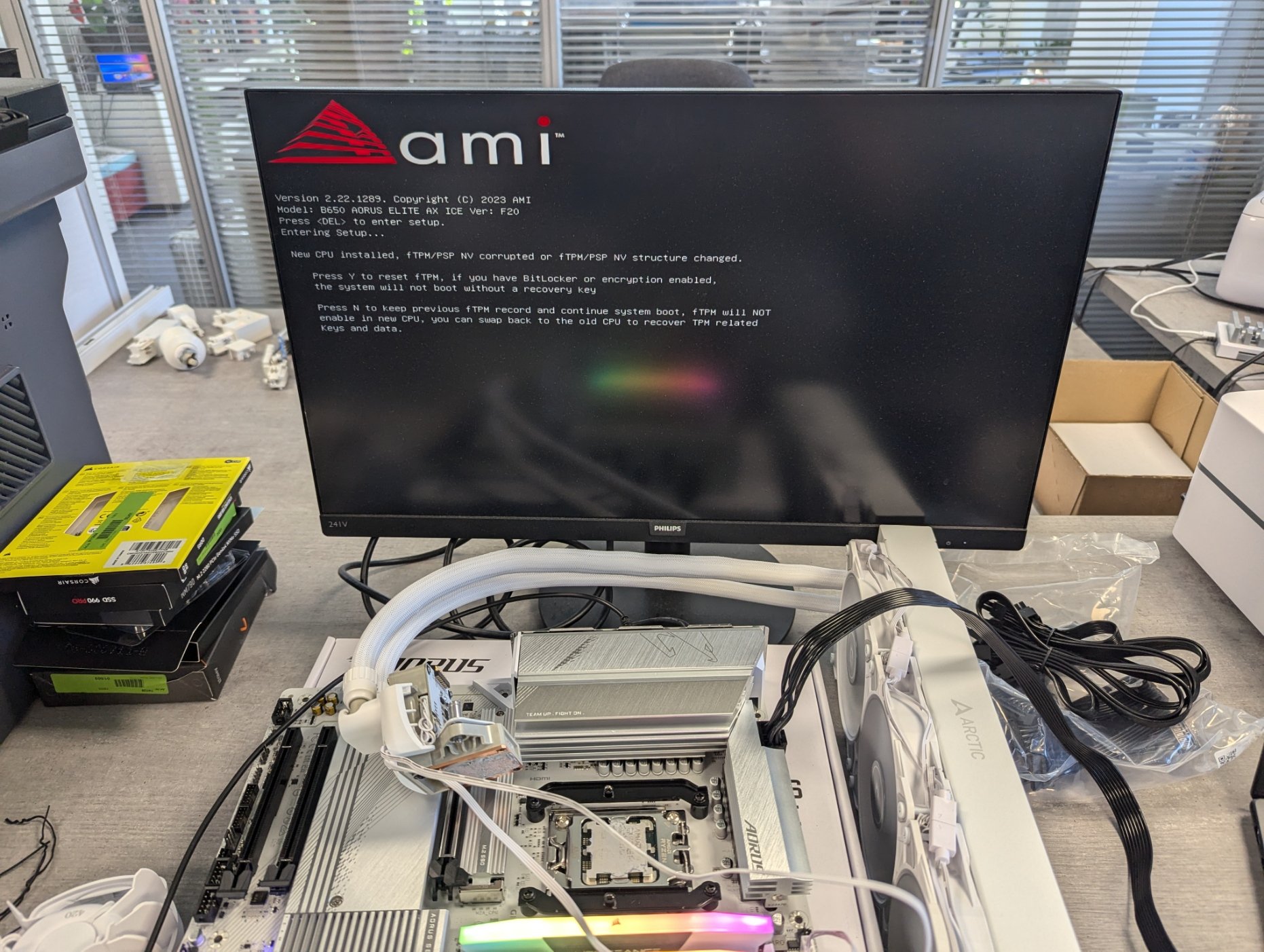 Ich baue den PC das erste Mal zusammen. Nach der Installation vom CPU, RAM, den 2 SSDs und des CPU-Kühlers wollte ich zuerst einen Test Boot durchführen, bevor ich es ins Gehäuse einbaue. (siehe Fotos)