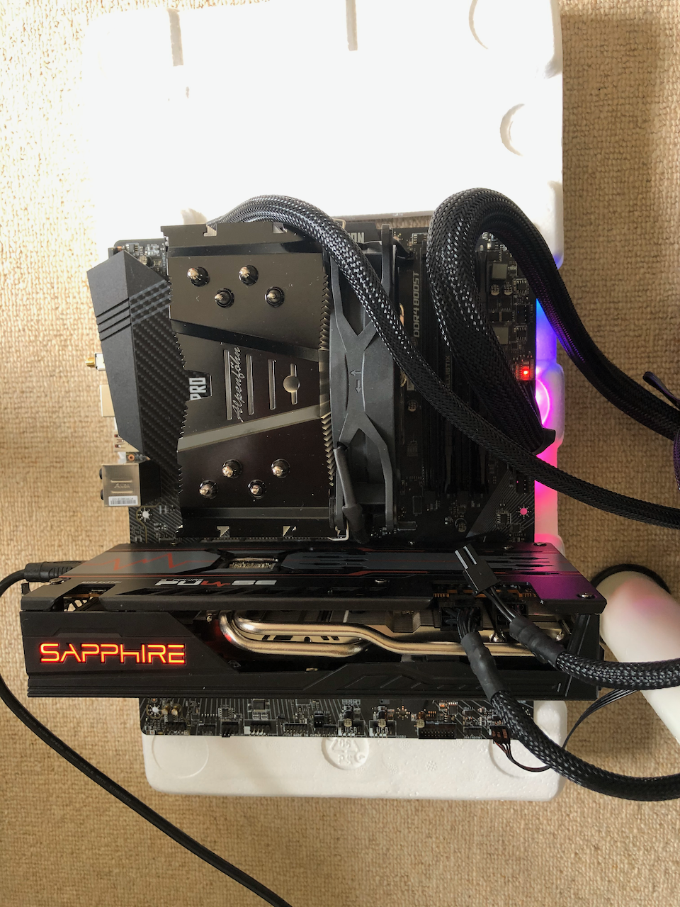 Wenn ich die Graka aus dem PCIe Slot entferne, ist das Verhalten das gleiche, Sapphire Logo leuchtet dann auch nicht...