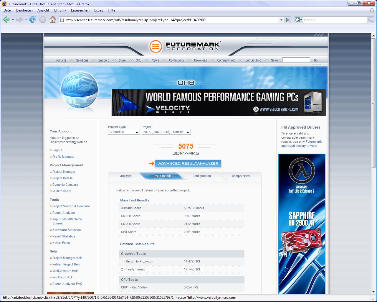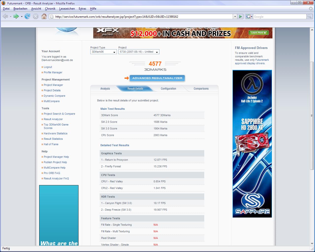 Ich habe die aktuelle Version des 3Dmarks unter XP home verwendet mit den beschriebenen Treibern -nackt ohne CCC und ohne ATT. Ich weiß net mehr, ob ich C&Q an oder aus hatte, werde die nächsten Tage mit dem 7.10 (ebenfalls nackt ohne geänderte Einstellungen bzgl Quali etc) nochmal benchen -ohne C&Q (raubt Leistung) und mit dem AMD DC Optimizer.