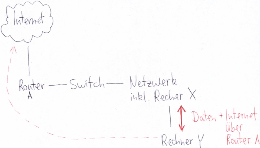 Es ging darum, dass sich ein Rechner X in einem Netzwerk (LAN) befindet, welches inkl. Router A an einem Switch hängt. Router A ist auch ein PC. So nutzen alle PCs die Internetverbindung von A (ICS von Win XP Pro soweit ich weiß) und können auch Daten untereinander tauschen.