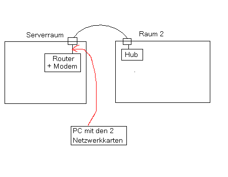 Ich würde ja den Computer mit den zwei Karten am Hub anschließen, aber der Hub steht ziemlich weit weg und das eine Kabel vom Hub zum Router ist fest verlegt. (Hab gerade zur Verdeutlichung eine Skizze angehangen)