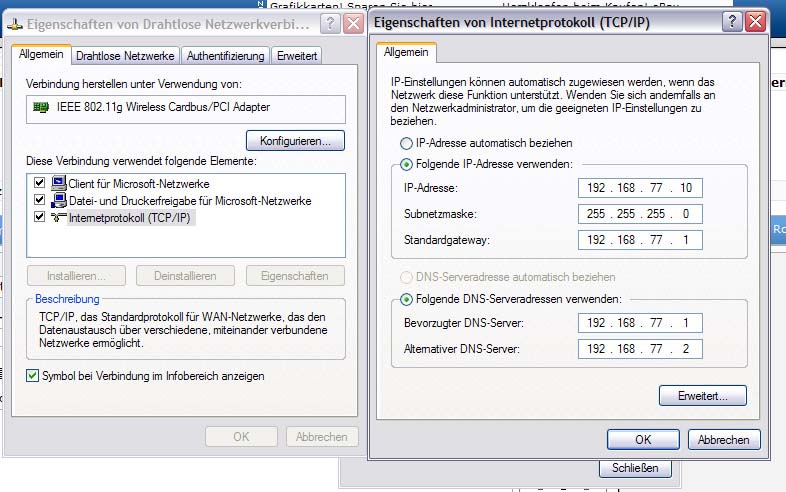 wichtig, wenn du es so machst: auf dem router dhcp deaktivieren und immer gleiche arbeitsgruppe einstellen