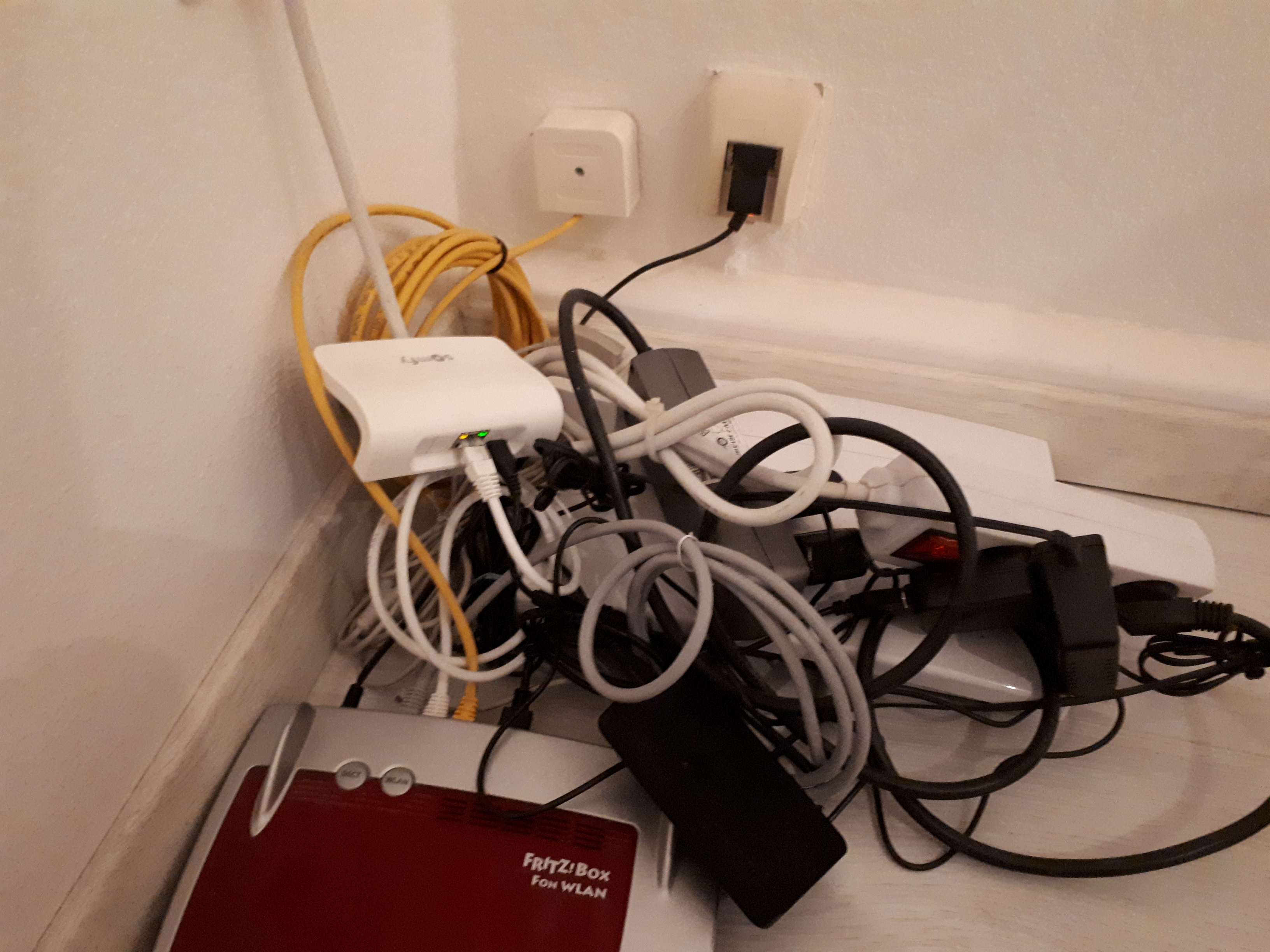 In meinem Eigenheim liegen mein Router (Fritzbox 7360), eine Somfy Connexoon (Rollladensteuerung), Somfy Alarmzentrale und das Netzwerk Kabel für die Außenkameras in der Wohnzimmerecke ,hinter ein paar Pflanzen, löse auf dem Boden.