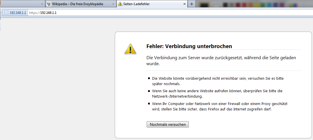 Vorher habe ich aus Sicherheitsgründen immer nur über HTTPS auf die Konfigurationsoberfläche zugegriffen, der Zugang über HTTP war deaktiviert. So soll das nach meinem Geschmack auch bleiben, aber der Router macht da seit gestern nicht mehr mit und Firefox spuckt beim Versuch über HTTPS draufzukommen nur eine Fehlermeldung aus, siehe Anhang. Beim IE besteht das gleiche Problem.