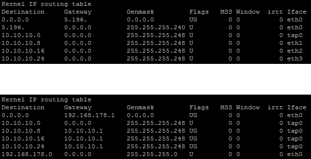 Der unter Router steht bei mir zuhause im 192.168.178.0 netz. Aus diesem Netzwerk möchte ich un gerne auf alle 10er netze zugreifen können. Leider funktioniert das nur auf den Router direkt, also die beiden Router können sich gegenseitig auf beiden Interfaces pingen und auch alle anderen Netzwerke erreichen. Was nicht geht ich aber brauchen das auch alle Clients in den Netzwerk sich gegenseitig erreichen können dies funktionier gegenwärtig nur in den 10er netzen das 192er netzt kann nicht erreicht werden und von dort aus erreicht man auch die 10er Adressen nicht. Jemand ne Idee was ich noch eintragen muss damit das so funktioniert wie ich mir das vorstelle?