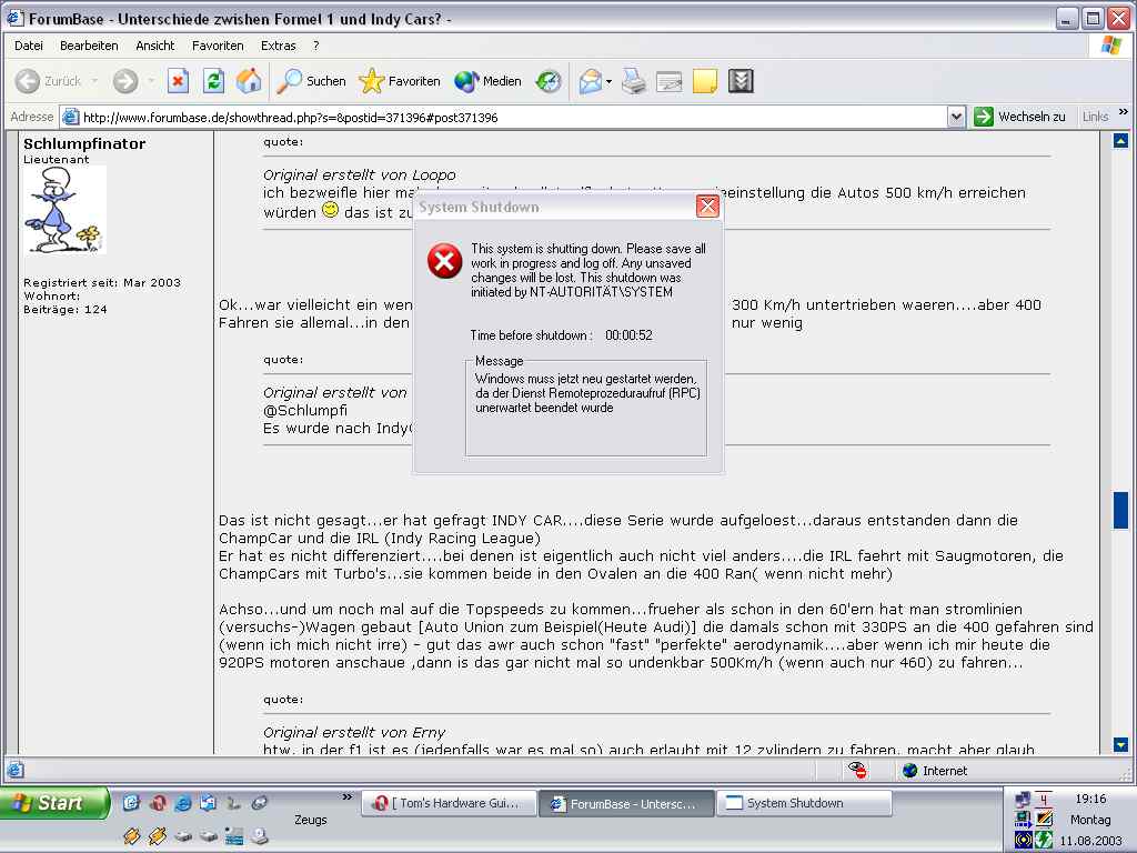 Hab n' riesen Problem. Nachdem ich ein paar minuten im Internet gesurft hab sagt mir mein PC, das der Dienst "Remoteprozeduraufruf" unerwartet beendet wurde.
