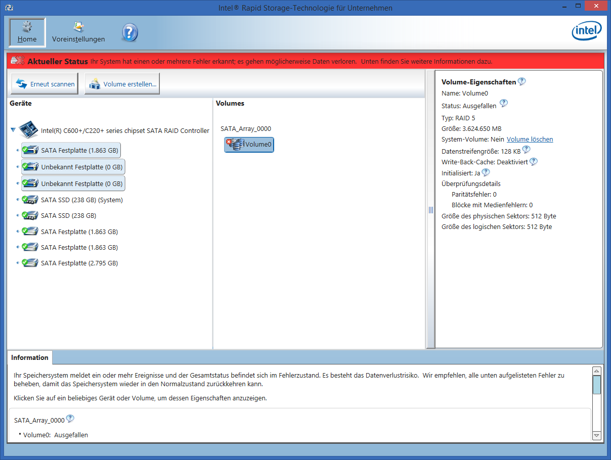 Alternativ kann man wie oben beschrieben auch die Metadaten manuell wiederherstellen, solang aber nichts geändert oder initialisiert wurde an den Platten, sollte der oben genannte „kurze“ Weg gehen.