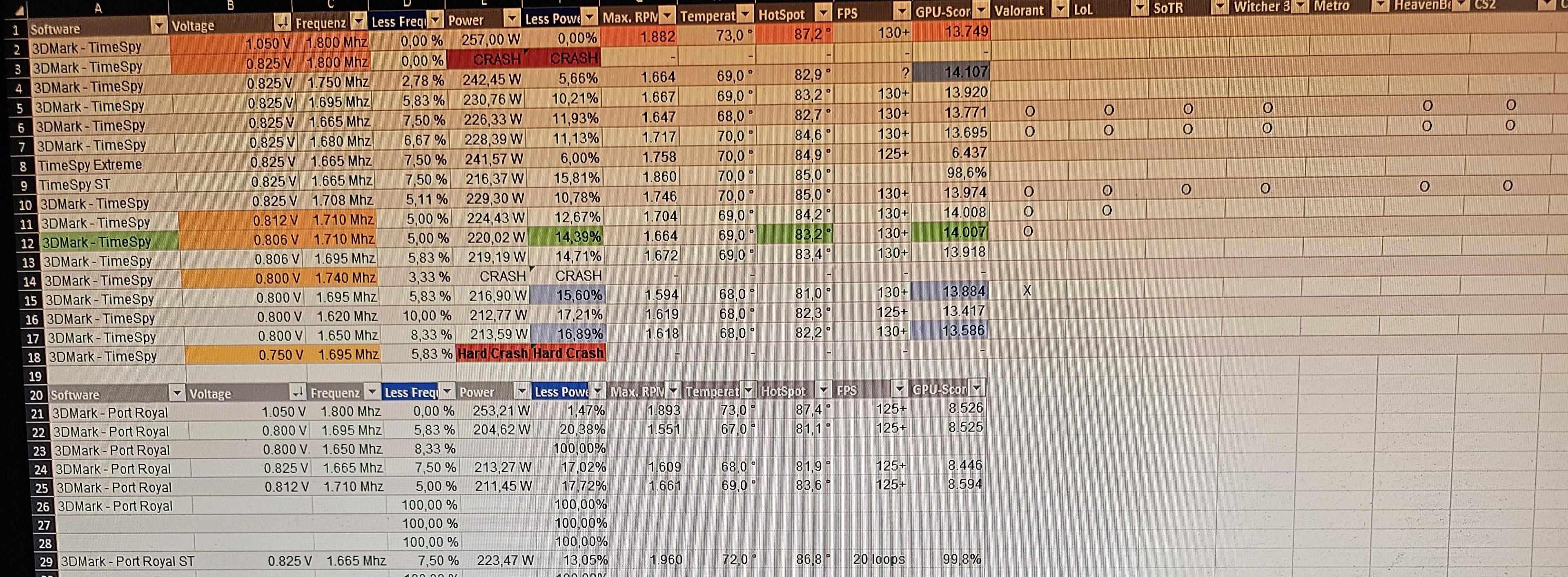In Valorant läuft es leider noch nicht 100% stabil mit 0.8V @ 1695 MHz, habe daher aktuell im Test 0.825V@1665MHz. Sofern Interesse besteht, kann ich die Tabelle irgendwann auch Updaten.