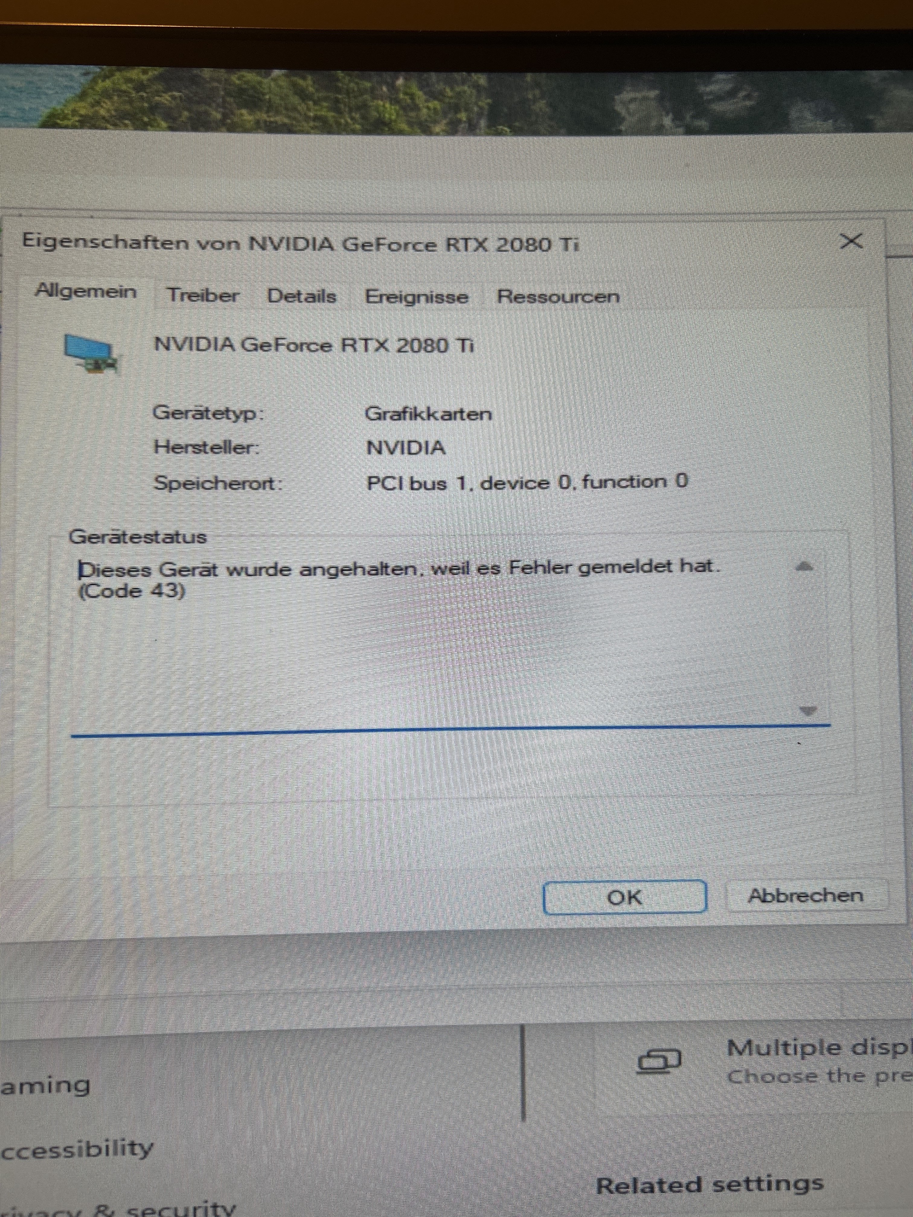 Hallo zusammen, Ich habe Probleme mit meiner RTX 2080Ti. Sie wird von keiner app erkannt weder von MSI afterburner noch von Nvidia selbst. Im Geräte Manager sieht man dieses gelbe Dreieck mit einem Ausrufezeichen bei der Grafikkarte. Im Reiter Eigenschaften sieht man den Fehlercode „43.“ Wenn ich die Auflösung auf 1920x1080 schalte kommen viele Artefakte aber auf der Auflösung 1280x1024 sind absolut keine Artefakte.