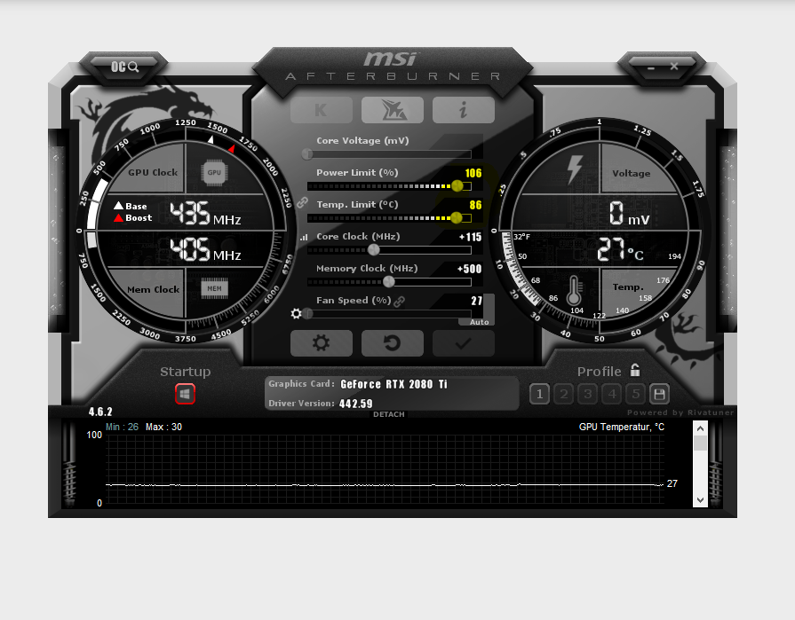 Meine 2080ti läuft auf den Afterburner-Einstellungen oben und wird mit einer NZXT-AiO gekühlt (Kraken X52 + Kraken G12):