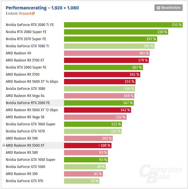 Nimmt mah hingegen die 5500XT als Vergleichsbasis für die 5700XT dann sieht die Lage doch etwas anders aus. Beide haben auf dem Papier ähnliche Taktbereiche, die 5700XT hat ca. 82% mehr Shader und sie war ca. 79% schneller. Das sieht wiederum nach einer ziemlich fiesen Skalierung aus.