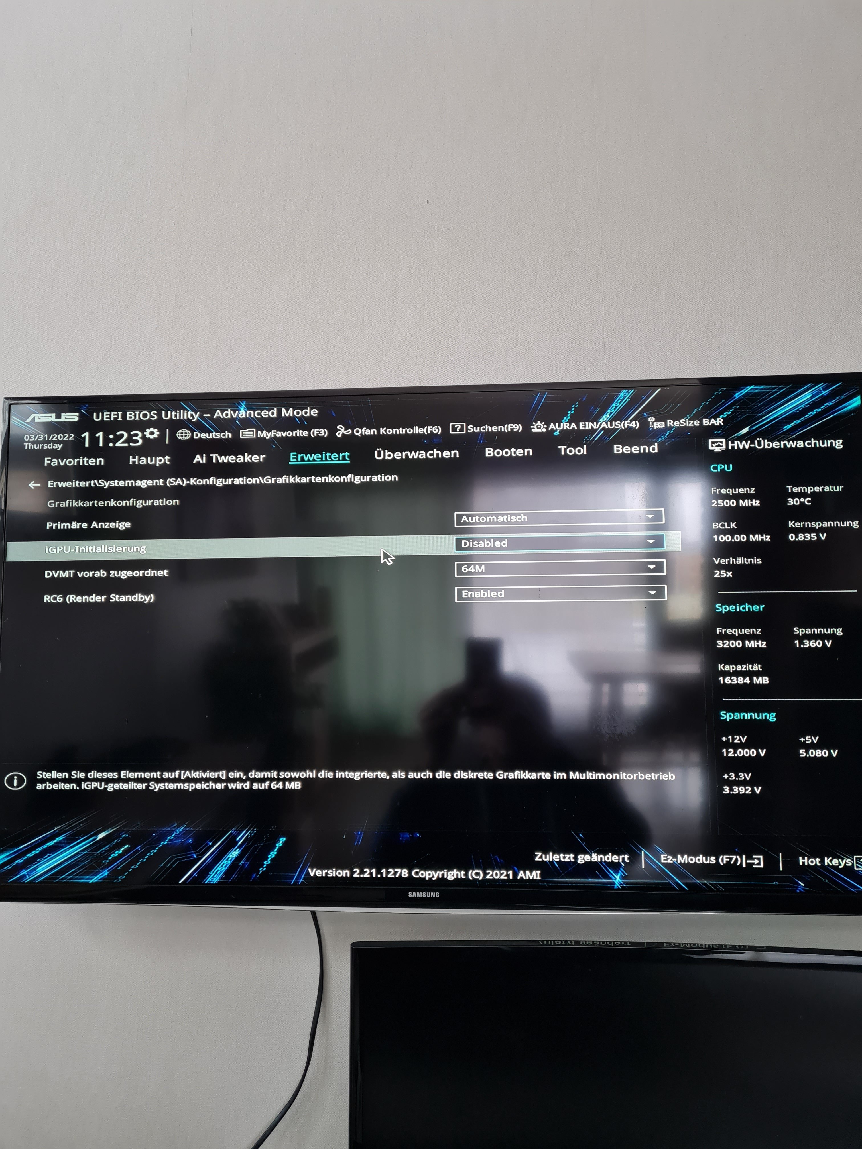 Nein... es soll einfach nur ddie rtx bild senden... da kommt nichts.. nur auf der uhd graphics von intel.Helping_Hand schrieb:Frage: Du möchtest letztendlich beide Monitore an der RTX3060 betreiben, richtig? Dann würde ich im BIOS die Multi-GPU-Einstellung deaktivieren und bei Graphics Configuration PEG anstatt PCIe bzw. AUTO einstellen. PEG definiert den Slot als PCIe x16-Slot und liefert der Karte über den Slot 75 Watt, anstatt lediglich 25 Watt bei PCIe.