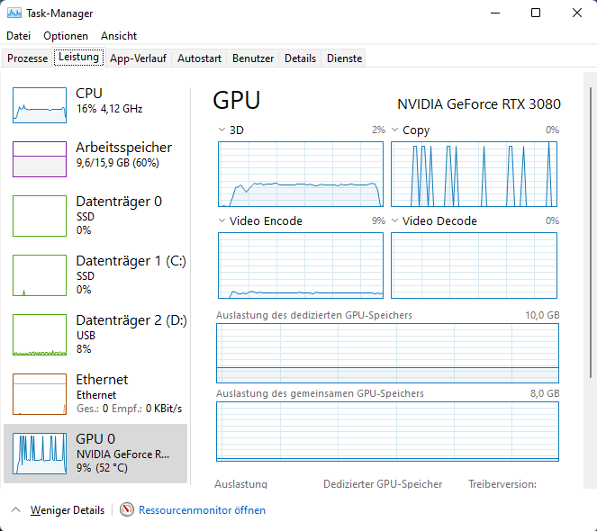 ich habe vor ca. 3 Tagen meine Grafikkarte (gtx 1660 Super) durch eine RTX 3080 abgelöst und seit dem muss ich leider feststellen das in Games wie z.B. Rainbow Six Siege die Grafikkarte die ganze Zeit von 50% auf 96% Auslastung springt. Zudem habe ich gemerkt das unter dem Task Manager wenn ich auf die Gpu drücke die "Copy" Skala alle paar Sekunden auf 96% springt und nach 1 Sekunde wieder auf 0% fällt, ist das Normal oder nicht?