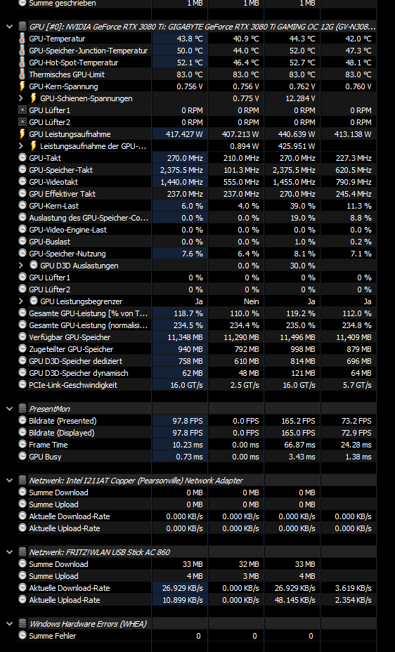 Die GPU Taktfrequenz ist zwischen 210 MHz und maximal 270 MHz. Außerdem hat sie auf dem Desktop einen Verbauch von ca 400 Watt. (8 Pin #1 20 W, 8 Pin #2 380 W). In spiele und Benchmarks steigt die GPU Auslastung, aber über die 270MHz Taktrate geht sie nicht. Verbraucht zwar laut anzeigen etc 400W, aber die Temperatur ist bei so ca 50°C.