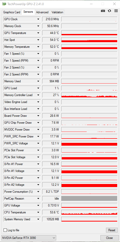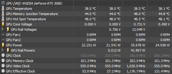 Ich hab zwar keine 3080 sondern eine 3090FE aber zum vergleich einfach mal meine Werte im Leerlauf. Gehäuse ist offen. Ich würde gern mal GPU-Z sehen, da hier deutlich mehr infos drauf sind. Wenn da irgendwas die GPU belastet, sieht man das ganz schön.