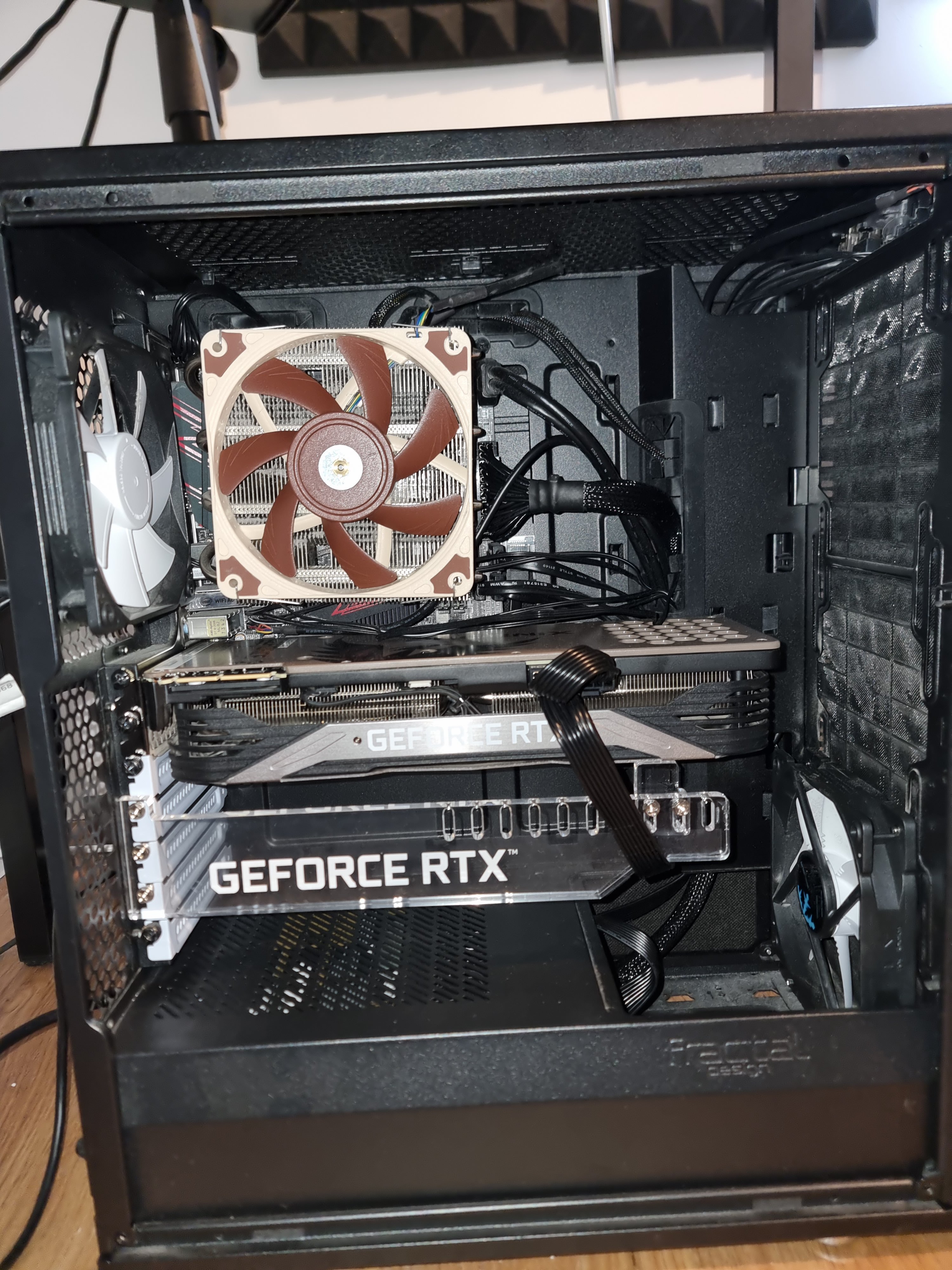 Ich verwende einen Fan vorne für den Intake und einen Fan hinten um die Luft herauszutragen. Die Lüfter sind die Standard-Dinger, die in meinem Fractal Gehäuse vorinstalliert waren. Weiterhin wird meine CPU momentan mit einem Top-Blow Lüfter von Noctua gekühlt. Wahrscheinlich ist das auch nicht ideal. Allerdings kann ich mir wiederum nicht vorstellen, dass ich mit Änderungen an der Lüftersituation auf das selbe Niveau komme, die ich mit dem offenen Gehäuse + Ventilator erreiche.