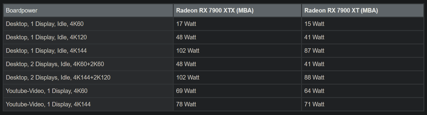 "The AMD RDNA3 architecture is optimized to ensure responsive performance with the highest refresh rates. The newest high-resolution and refresh monitors require significant memory bandwidth and initial launch on RX 7900 series cards gaming cards have been tuned to ensure optimal display performance. This may result in higher idle power and fan speeds with certain displays. We're looking into further optimizing the product going forward."