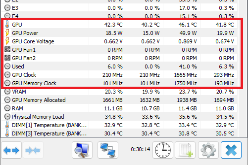 Diese Werte hier wären interessant, besonders eben die Max-Werte nach einem Benchmark-Lauf. Vorher bitte immer erst die Werte unten über die Uhr resetten.
