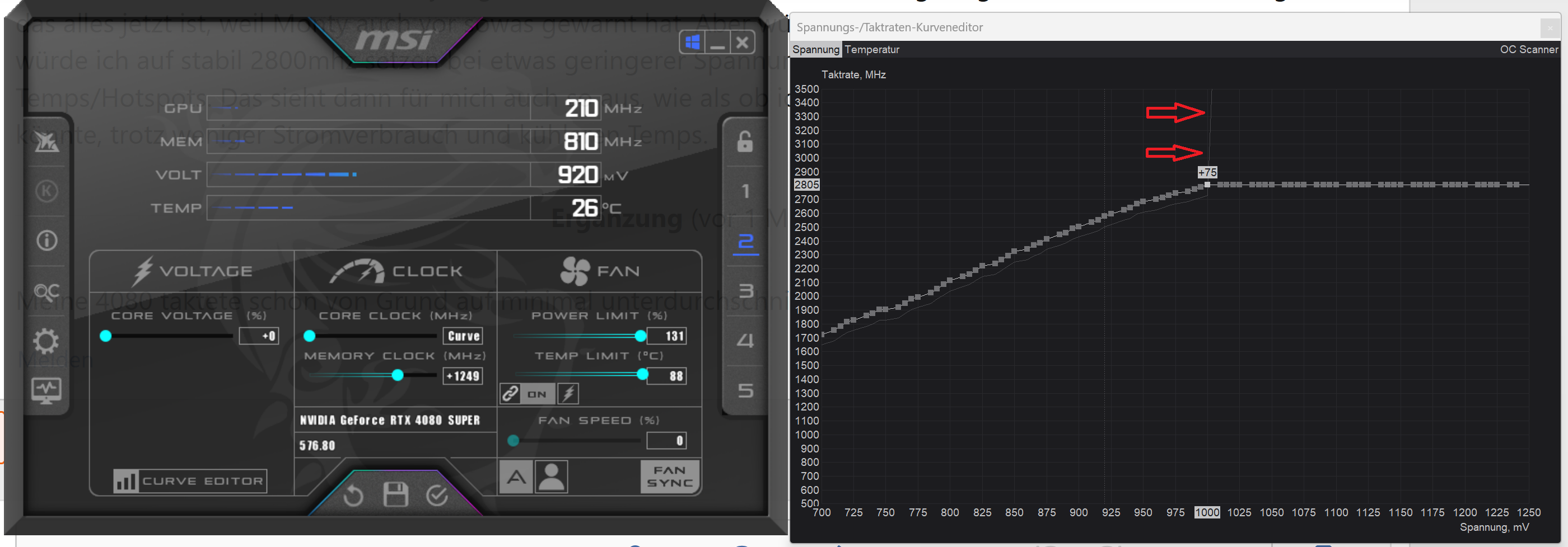 Ich hab mir ein Video von DasMonty angeschaut, der das bei einer RTX 4080 gezeigt hat. Ich weiß nicht wie gefährlich das alles jetzt ist, weil Monty auch vor sowas gewarnt hat. Aber würde ich jetzt kopieren, was er gemacht hat, dann würde ich auf stabil 2800mhz setzen bei etwas geringerer Spannung und dadurch weniger Stromverbrauch und max Temps/Hotspots. Das sieht dann für mich auch so aus, wie als ob ich potentiell sogar 0-2% mehr FPS rausquetschen könnte, trotz weniger Stromverbrauch und kühleren Temps.