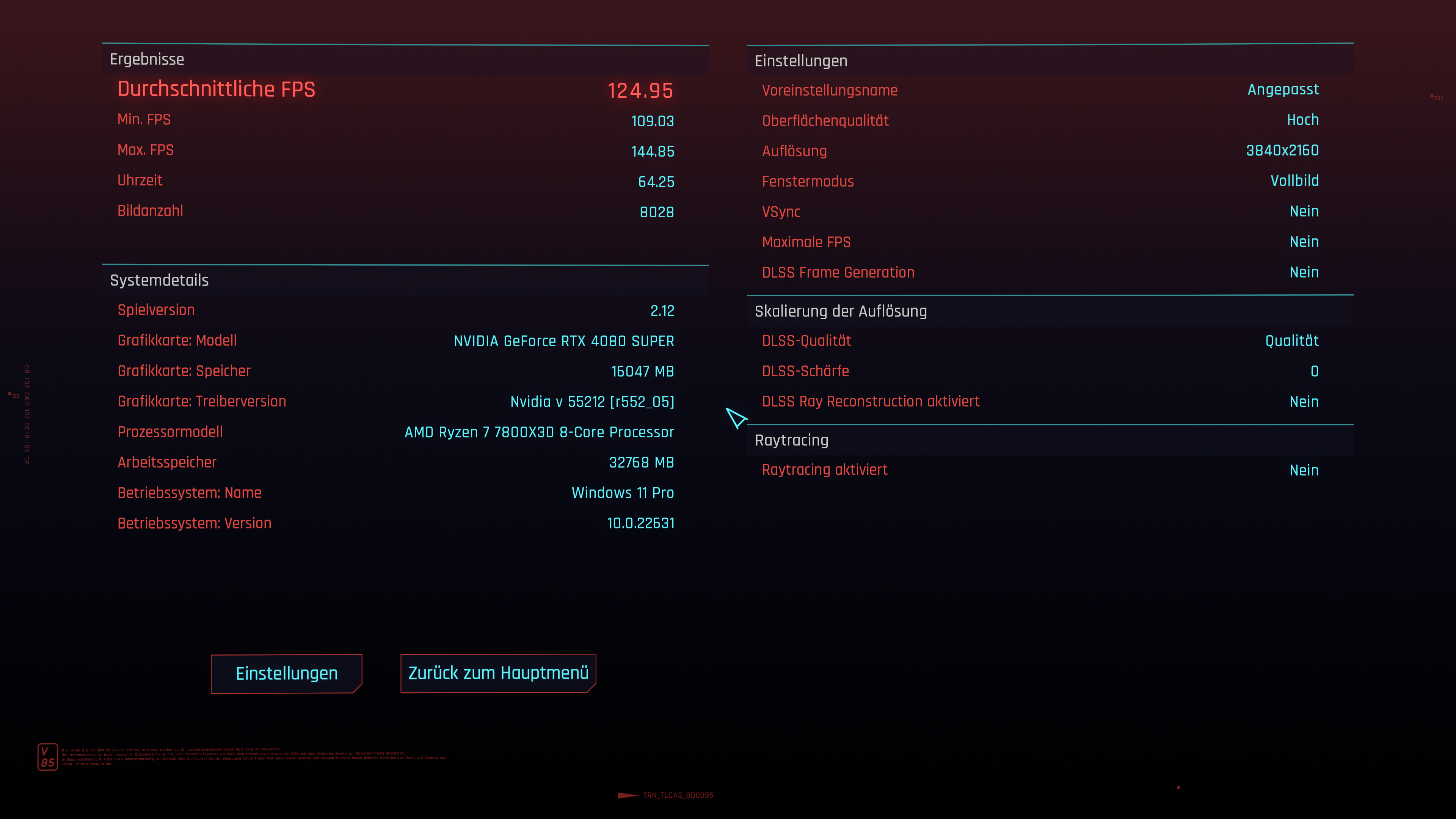 Ich habe vor einigen Tagen festgestellt dass meine Performance in Cyberpunk schlechter ist und nach ein paar Benchmarks konnte ich festellen dass ich mit Pathtracing Settings und ohne Frame Gen ähnliche FPS wie der 4080S Benchmark der Redaktion erhalte, wenn ich jedoch Frame Gen dazu schalte fehlen mir aufeinmal 10-14 im Endergebniss. Ich habe es auch nochmal mit Raster und den im Bild angegeben Settings versucht und musste hier sogar feststellen das FG kein bisschen Verbesserung auf die Framerate bringt. Die Frage die ich mir nun stelle ist wie könnte ich versuchen das Problem zu beheben?