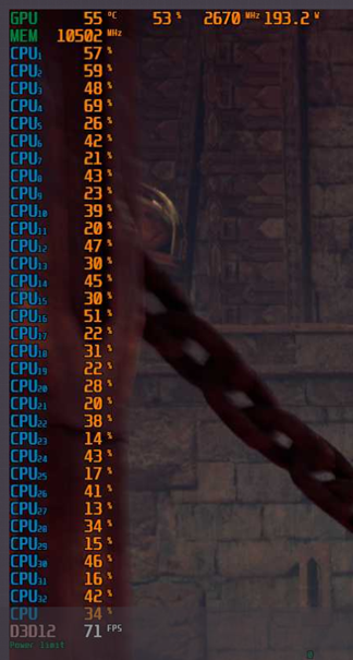 Auffallend dabei ist, dass die Auslastung der Karte je nach Szene stark fluktuiert. Meistens dümpelt die Auslastung zwischen 50 und 70% herum, lediglich in manchen Szenen kommt sie an die 90%-100% Auslastung heran. Dabei verbraucht die Karte nicht mehr als 250 Watt. Egal ob bei 50% oder bei 100% Auslastung. Die Auslastung der CPU liegt dabei meistens zwischen 30 und 50%.