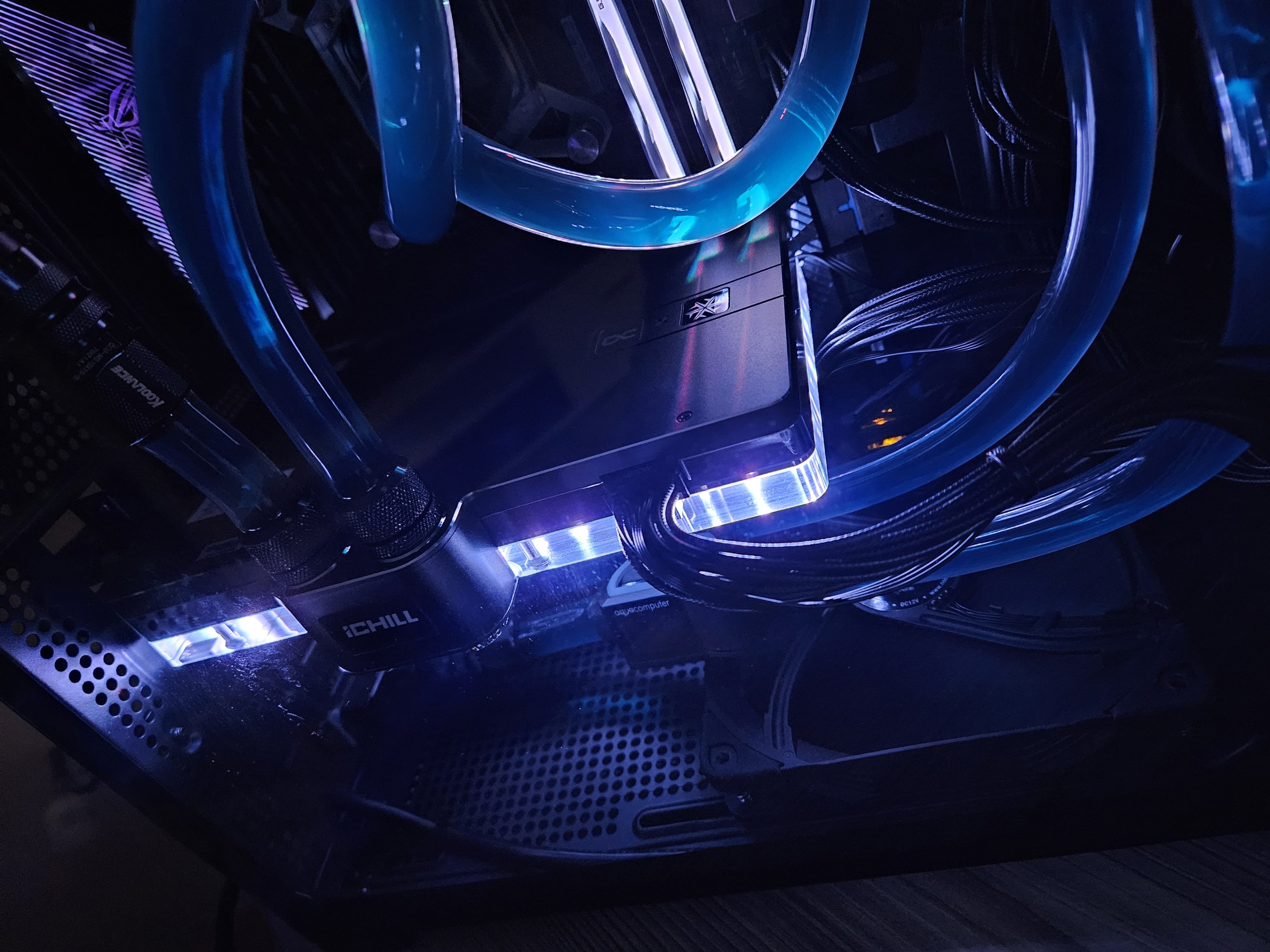 Das Ganze sieht jetzt so aus... ist das schon zu hart gebogen? Alternative Vorschläge? So lassen? Der Stecker sitzt bombig und die Kabel von Seasonic werden quasi nicht mal handwarm an der Biegung....