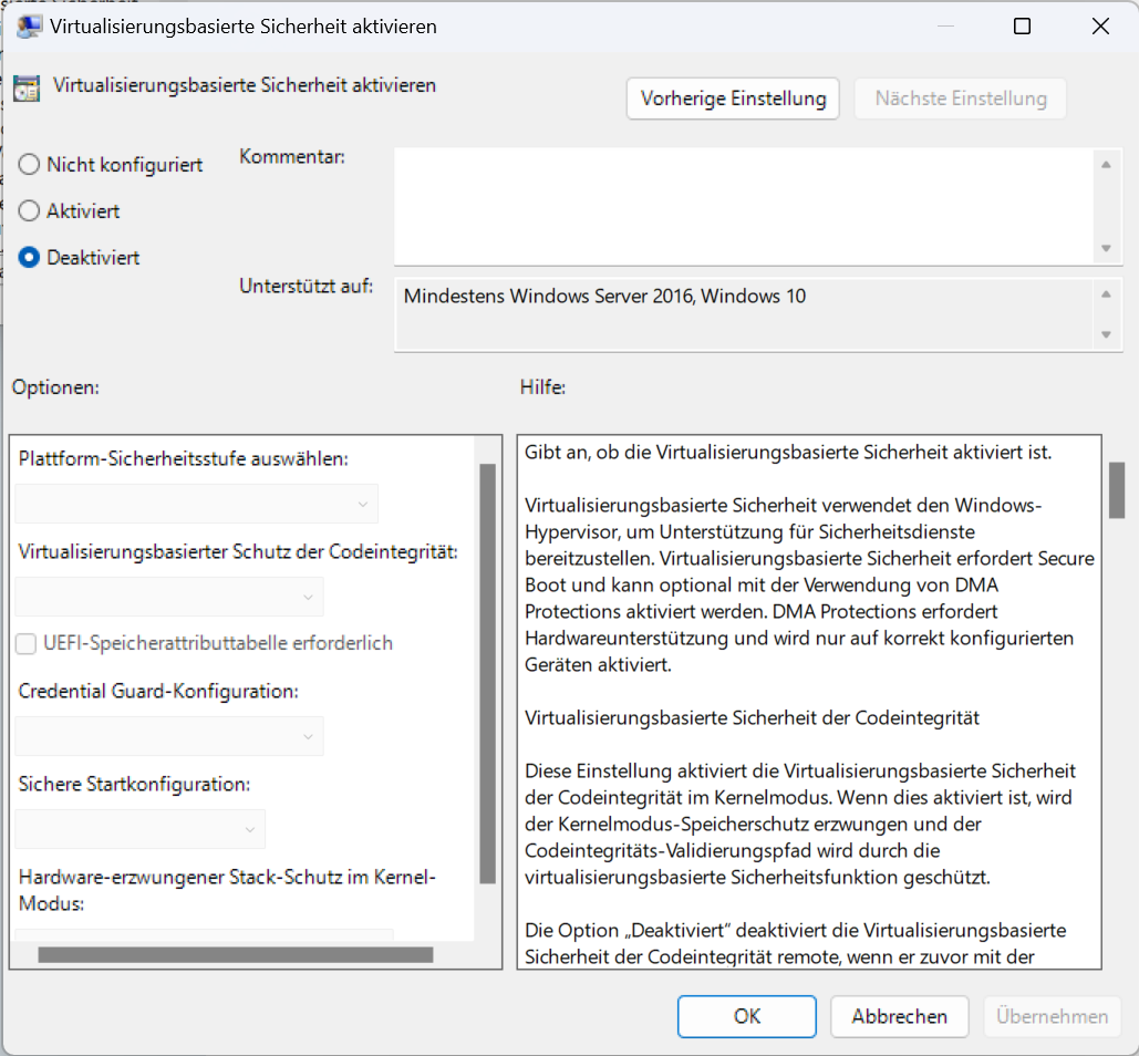 - über die Gruppenrichtlinien unter "Computerkonfiguration" > "Administrative Vorlagen" > "System" > "Device Guard" den Punkt "Virtualisierungsbasierte Sicherheit aktivieren" auf "Deaktiviert" gesetzt