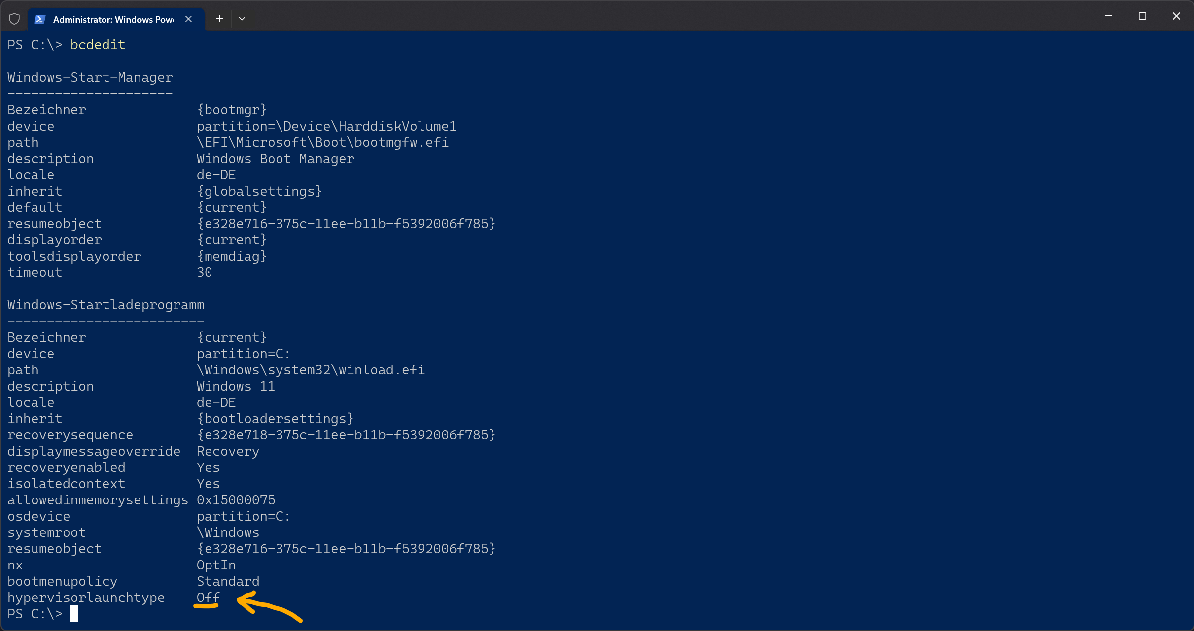 - mithilfe von 'bcdedit /set hypervisorlaunchtype off' den Start des Hyper-V Hypervisors unterbunden