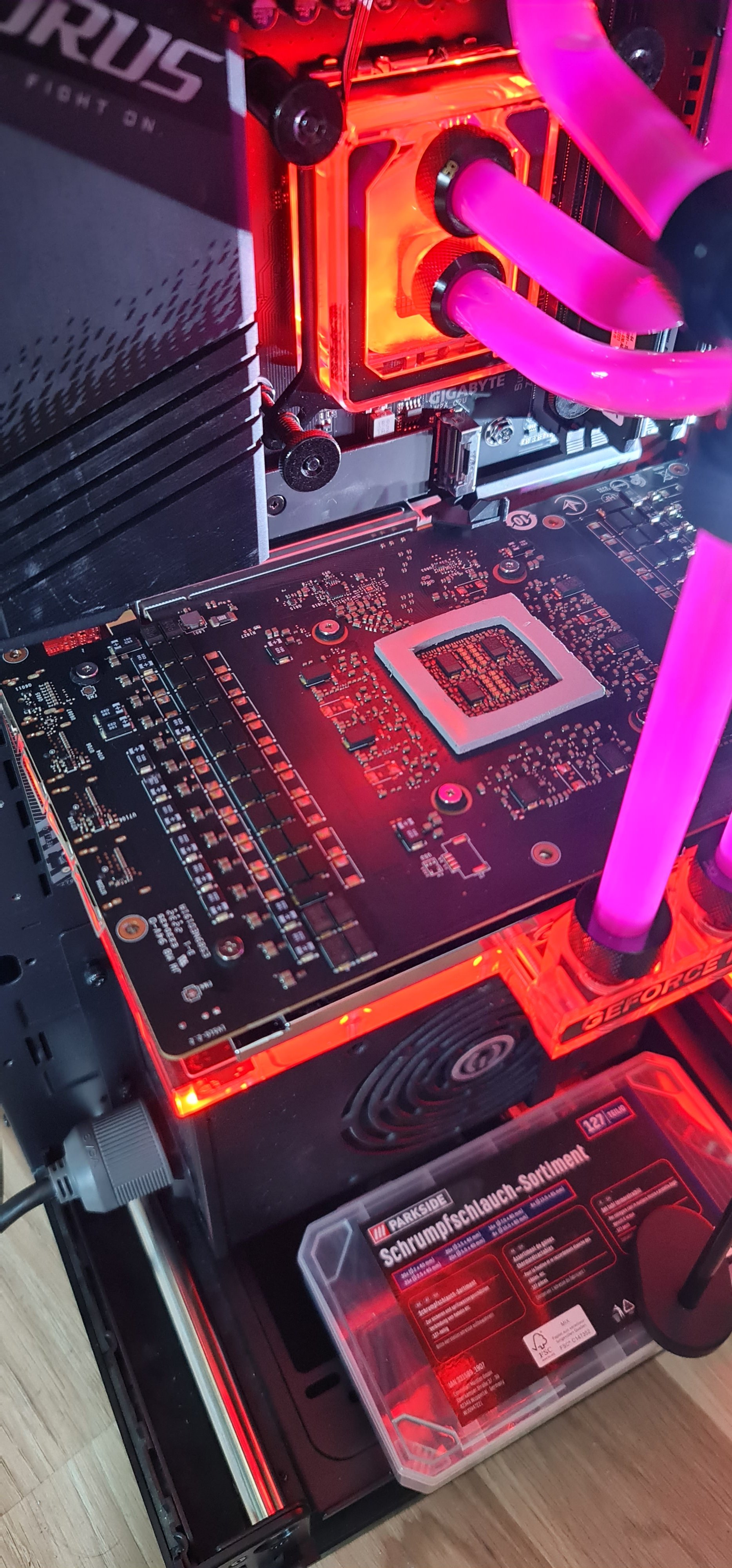 Gut dachte ich, kann ich die Grafikkarte ja wieder fest einbauen und die WaKü anschließen.