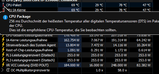 In meinem Fall habe ich P1 und P2 auf 253 Watt stehen, da ich mit meiner custom Wakü keine Probleme mit der Temperatur habe. In Games erreiche ich in der Regel nur um die 100 - 120 Watt und nur in einzelne Fälle auf etwa 160 Watt. Dadurch laufe ich in keine Leistungsgrenze und der Prozessor taktet daher bezüglich der Leistungsaufnahme nicht herunter.