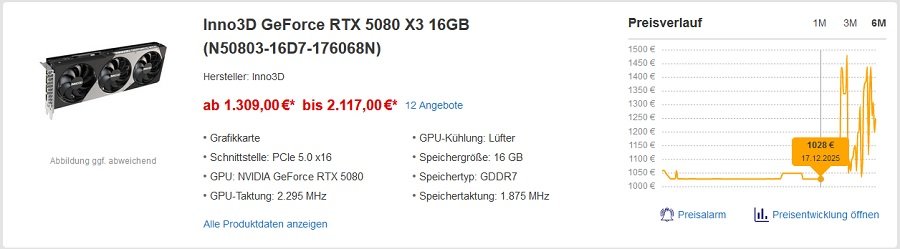 RTX 5080: 1.027,95€ -> 1.309€ sind sogar +27,3%