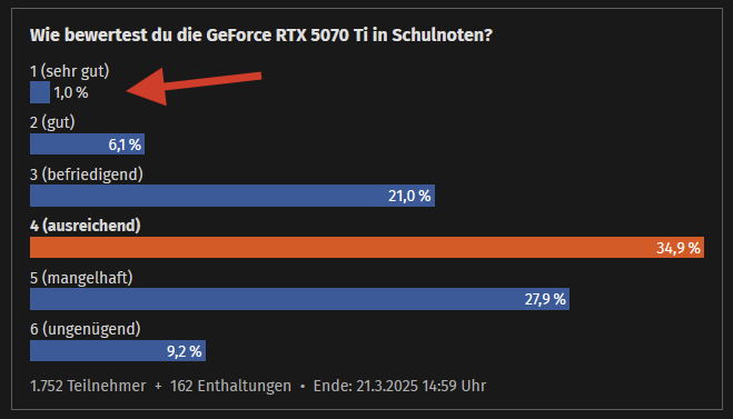 Weisst Du ja selber, bei 1700 Teilnehmer sind 1.0%, die der 5070Ti die Schulnote 1 geben, satte 17 Personen. Das ist schon überraschend. Ausser, es waren 16 Schweizer, bei welchen die Schulnote 1 die schlechteste Note darstellt ;-)