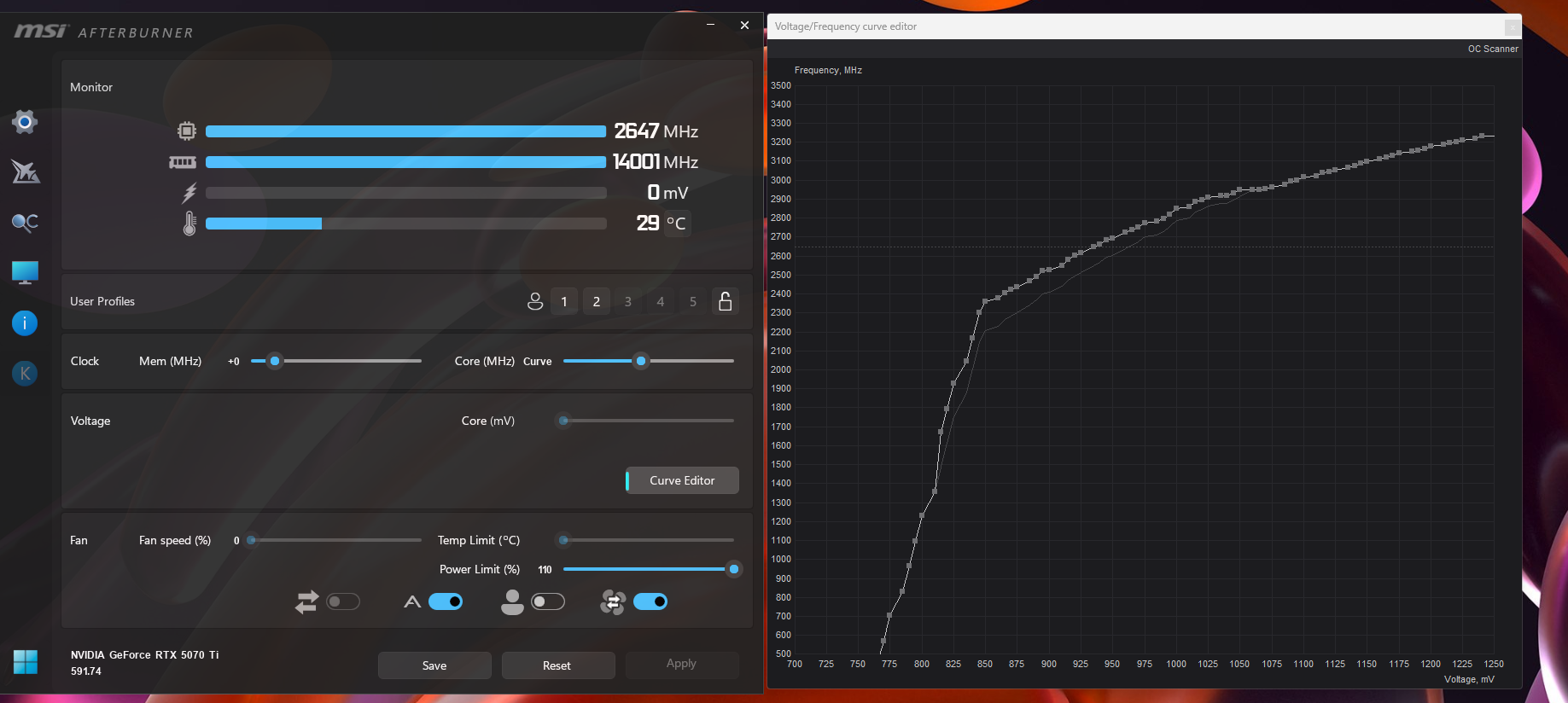 Hat jemand von euch Erfahrungswerte oder Empfehlungen für sinnvolle Spannungs-/Frequenzbereiche bei der RTX 5070 Ti bzw. vergleichbaren MSI-Karten?
