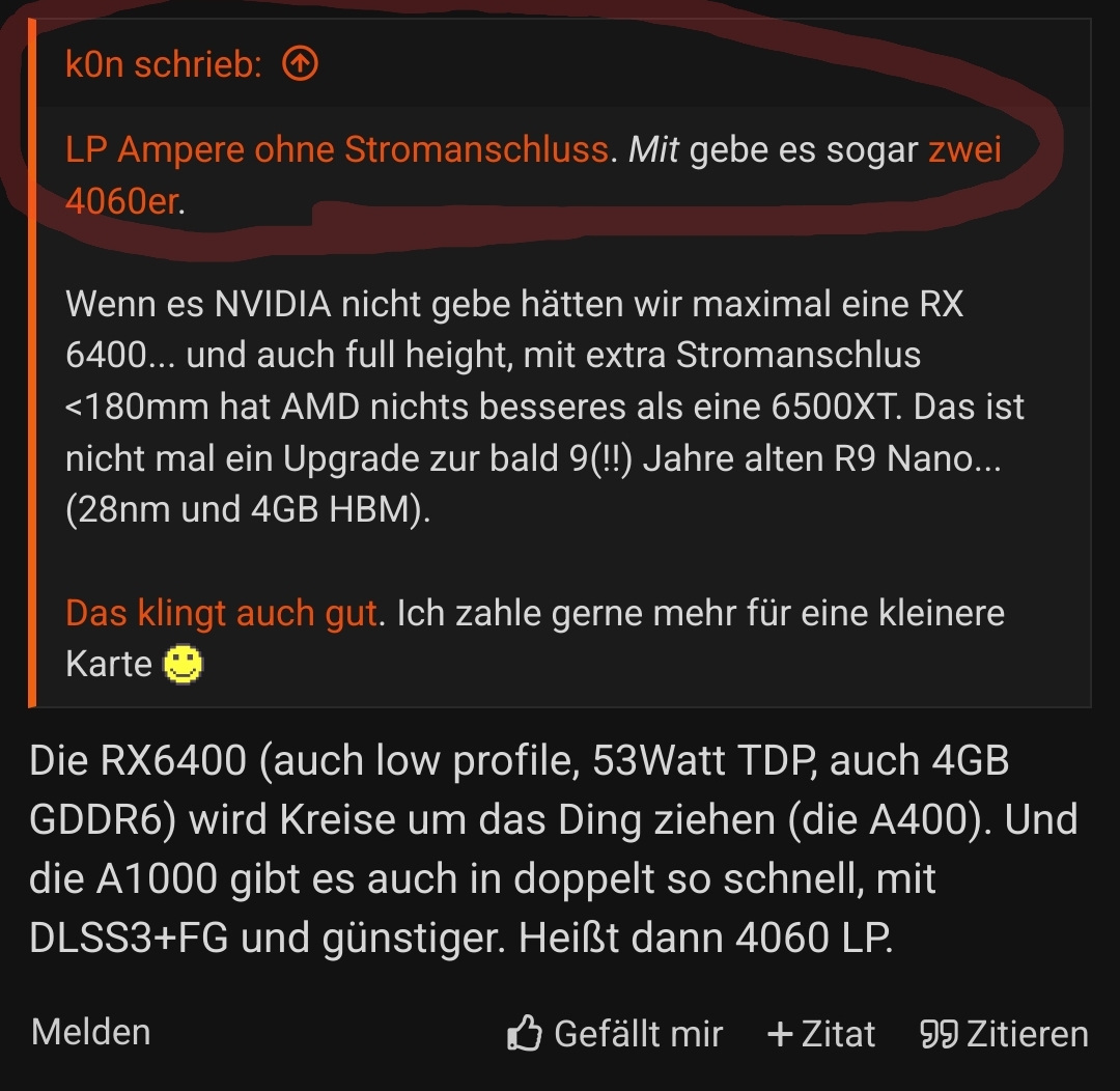 Schön, bringt nur für Live-Transkoding nichts. beim A2000 hatte man mit GA106 und 12GB zu schwache Encoder- und Decoder, um die 12GB VRAM auszulasten. Der A2000 Ada ist einfach viel teurer und der A1000 ein VRAM-Krüppel. Schade.