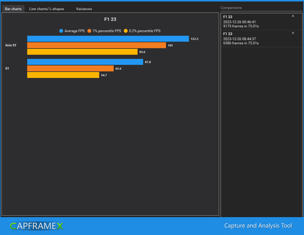 F1 23 4k CB Settings kein RT: Meine 122,3fps Avg, CB 151,4fps Avg ; Meine 105fps P1, CB 133,7fps P1