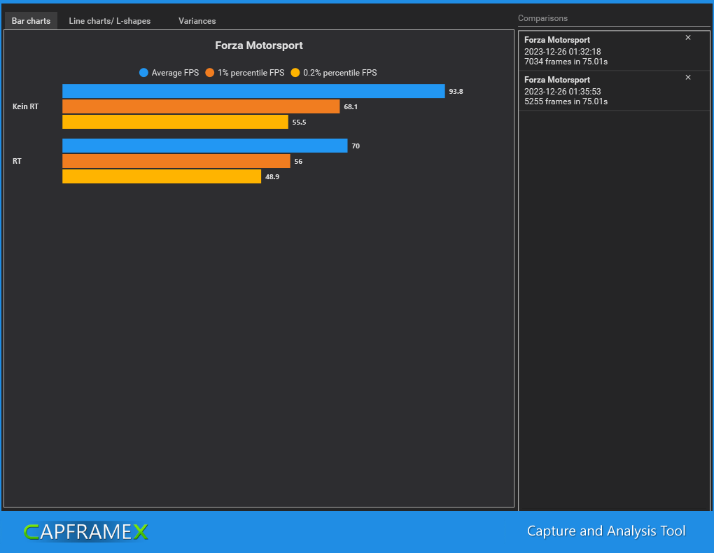 Forza Motorsport 4k CB Settings RT: Meine 70fps Avg, CB 74,7fps Avg ; Meine 56fps P1, CB 63,8fps P1
