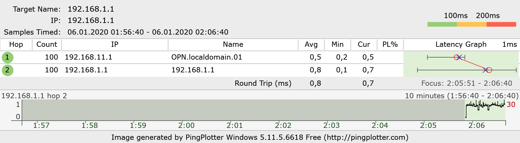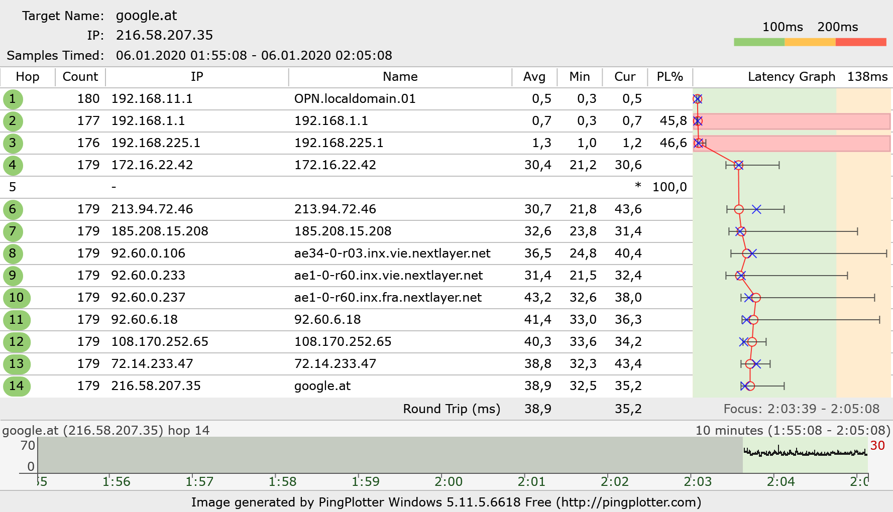 Also, schon ausprobiert. Beim anpingen von google.com durch PingPlotter bekomme ich Latenzen von ~25ms. Wenn ich aber den "hauseigenen" PingPlotter-Server trace, habe ich eine Latenz von ca. 125-130ms.