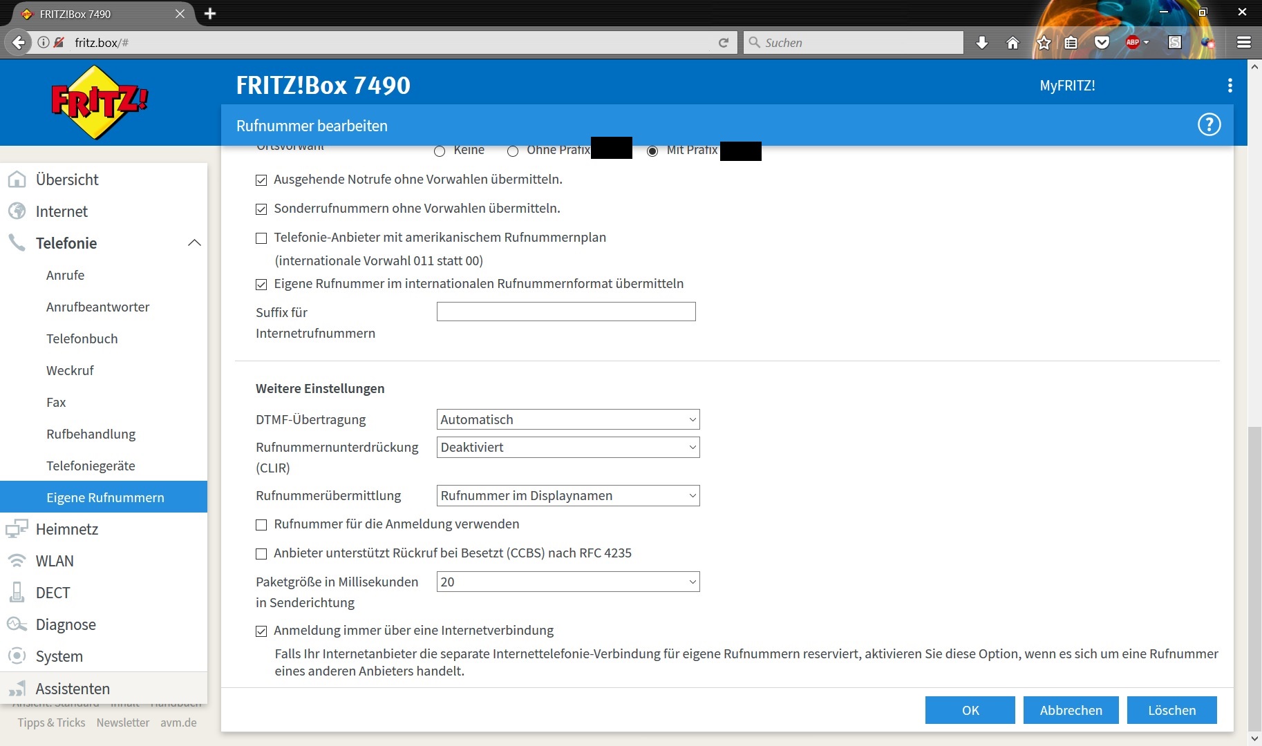 In der Fritzbox ist CLIR deaktiviert, sowohl unter "Eigene Rufnummern", als auch unter "Telefoniegeräte". Nachfolgend noch Screenshots der Einstellungen: