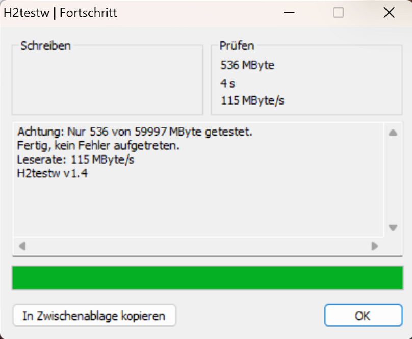Hier ein Teil vom Screenshot, von den Rufus Einstellungen, wie ich es vorher einstelle, und der USB Stick funktioniert sonst, hier als Bild was h2testw "sagt".