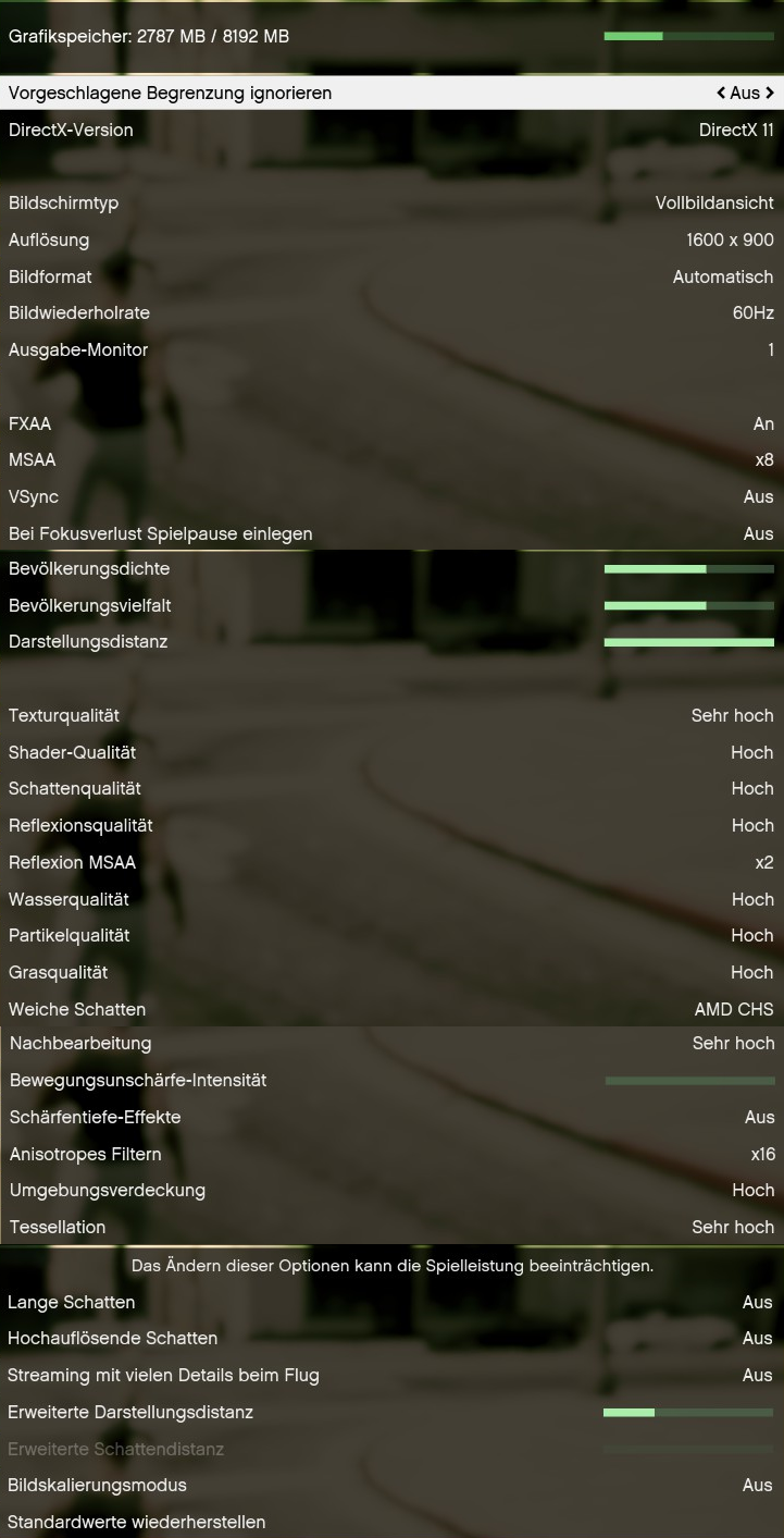 Allerdings stellt mich das ganze in GTA V vor Probleme, ich ich nun seit X Wochen nicht lösen kann. Nach dem Umstieg habe ich mich besonders auf GTA gefreut, da ich das vorher nur auf niedrigen bis mittleren Einstellungen spielen konnte. Ich war also immer ein nicht so besonders scharfes (da geringe Darstellungsdistanz) und nicht so hübsches (schlechte Kantenglättung) Bild gewöhnt. Meine restliche Hardware ist zwar nicht die Welt (Win 7, i5 4430 4x3Ghz, 16 GB RAM, ne mittelmäßige HDD), allerdings sollte es für ein ordentliches Bild in GTA durchaus reichen - Battlefield 1 läuft auf Ultra, Ghost Recon Wildlands bringt ein verdammt hübsches Bild hin usw.