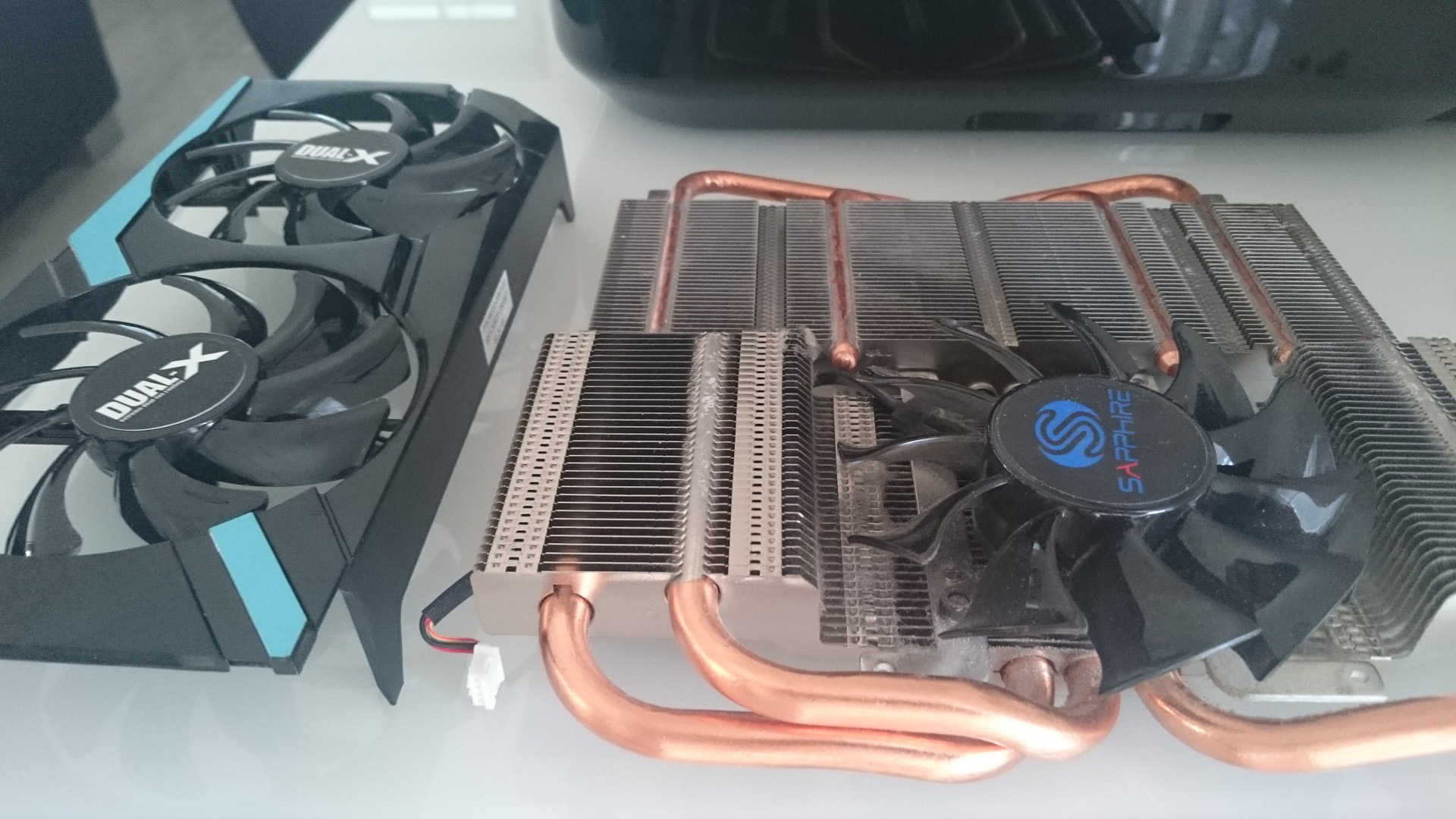 Doch wenn ich die Karte etwas fordere, muss ich den Lüfter über 3K RPM drehen lassen und sie wird schon zu einem ziemlichen Staubsauger. Außerdem möchte ich mit dem VRAM-Takt in Richtung 2200 gehen, da wird eine andere Kühllösung unabdingbar, da VRAM und SpaWa jetzt schon gegen 100° rennen. Da ich als armer Student nicht gerade gerne weitere 40€ für einen Accelero ausgebe und nebenbei auch gerne Bastle, hab ich jetzt mal in meinem Hardwarefriedhof gegraben und neben dem Kühler meiner alten 7870, auch eine alte 6870 gefunden.