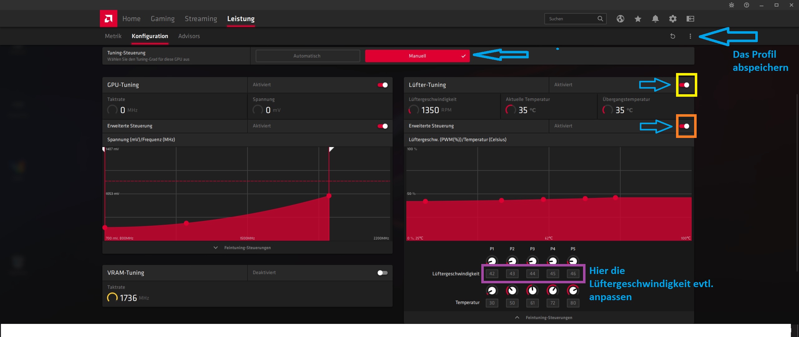 Teste wie die Grafikkarte läuft wenn sie nicht den "Zero"-Modus im Wattman nutzt.