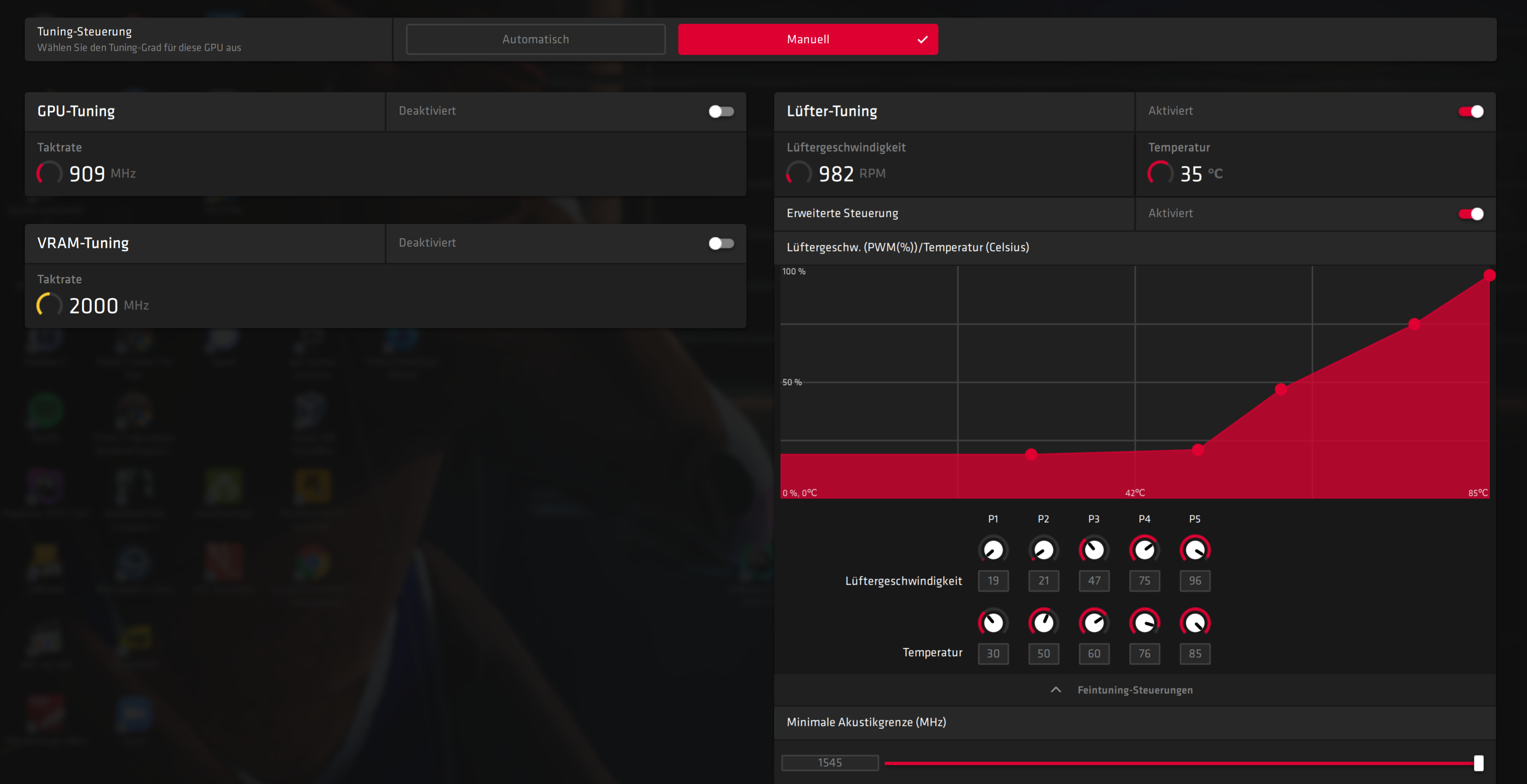 - Stelle ich die Lüfterkurve im AMD Treiberprogramm manuell ein, ist das alles überhaupt kein Problem. Bei 50% Lüftergeschwindigkeit dümpelt die Grafikkarte zwischen 60°C und 70°C und funktioniert hervorragend ohne ohne Absturz. Das sind meine aktuellen Einstellungen: