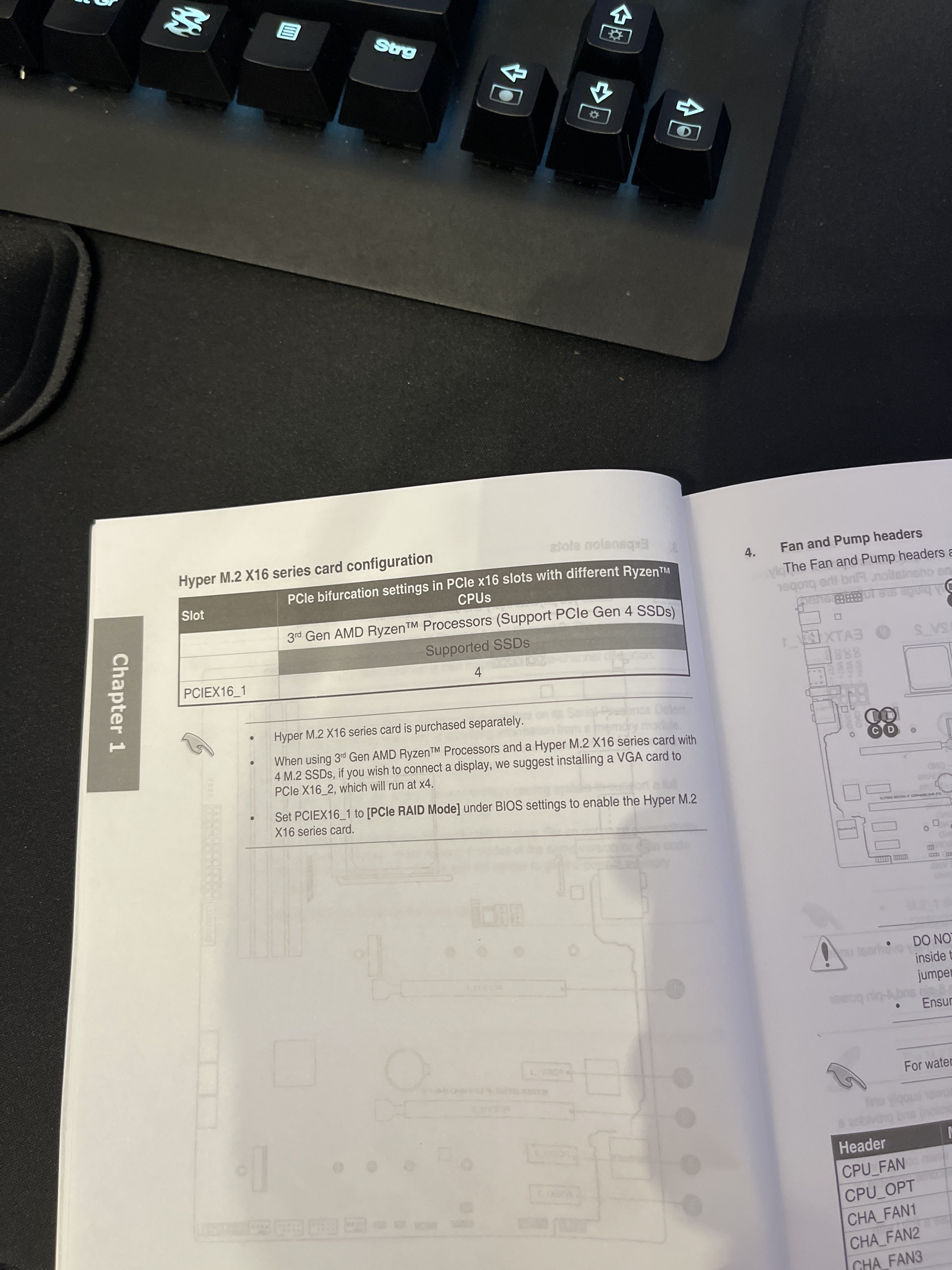 Der wichtigste Punkt ist wohl auf der 2. Seite: „When using 3rd gen AMD Ryzen Processors and a Hyper M.2 X16 series card with 4 M.2 SSDs, if you wish to connect a display, we suggest installing a VGA card to PCIe X16_2, which will run at x4“