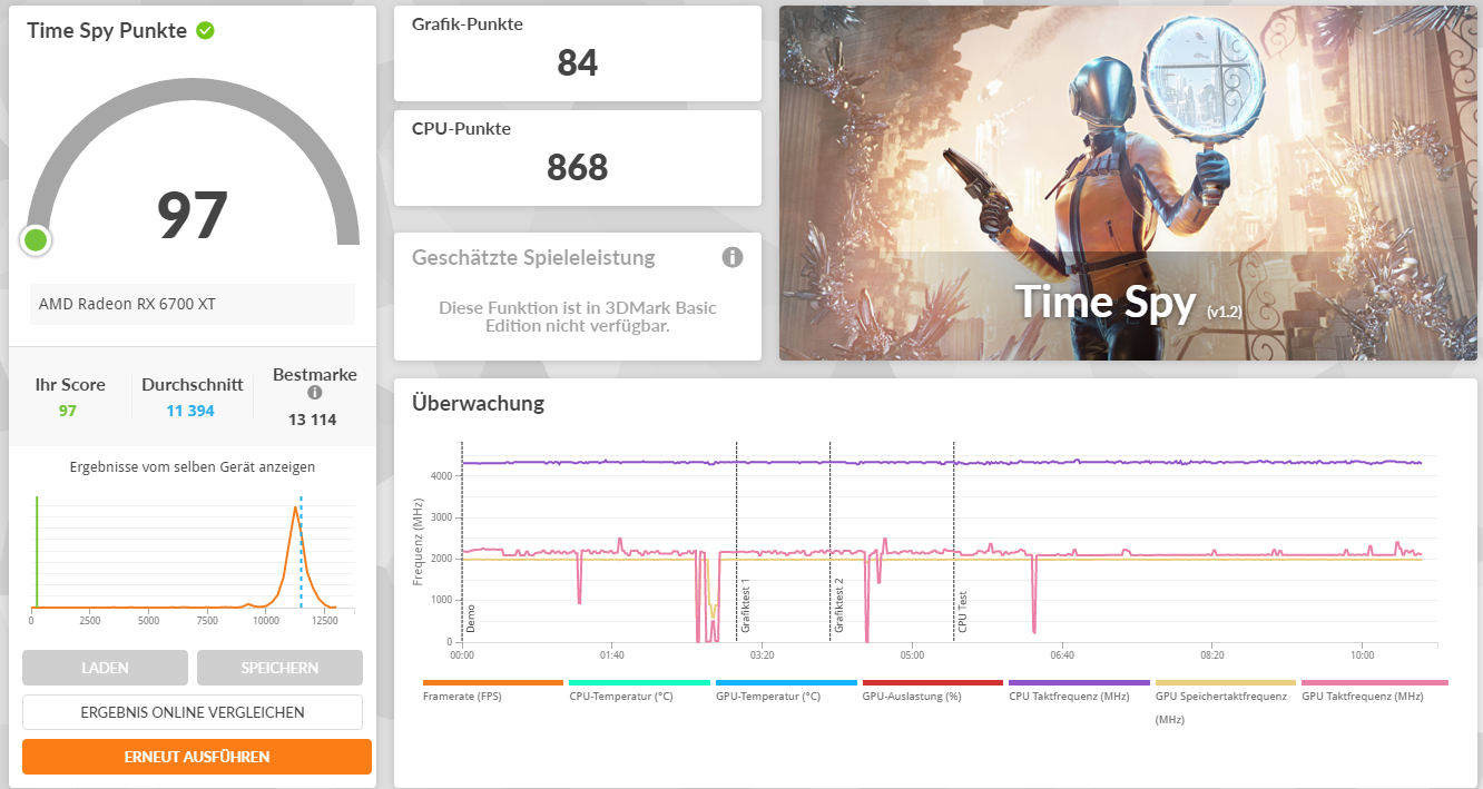 Ich habe im Anschluss einen 3D Mark Benchmark (Timespy) laufen lassen. Die Ergebnisse waren aber absolut unterirdisch. (Vgl. Bild: Benchmark)