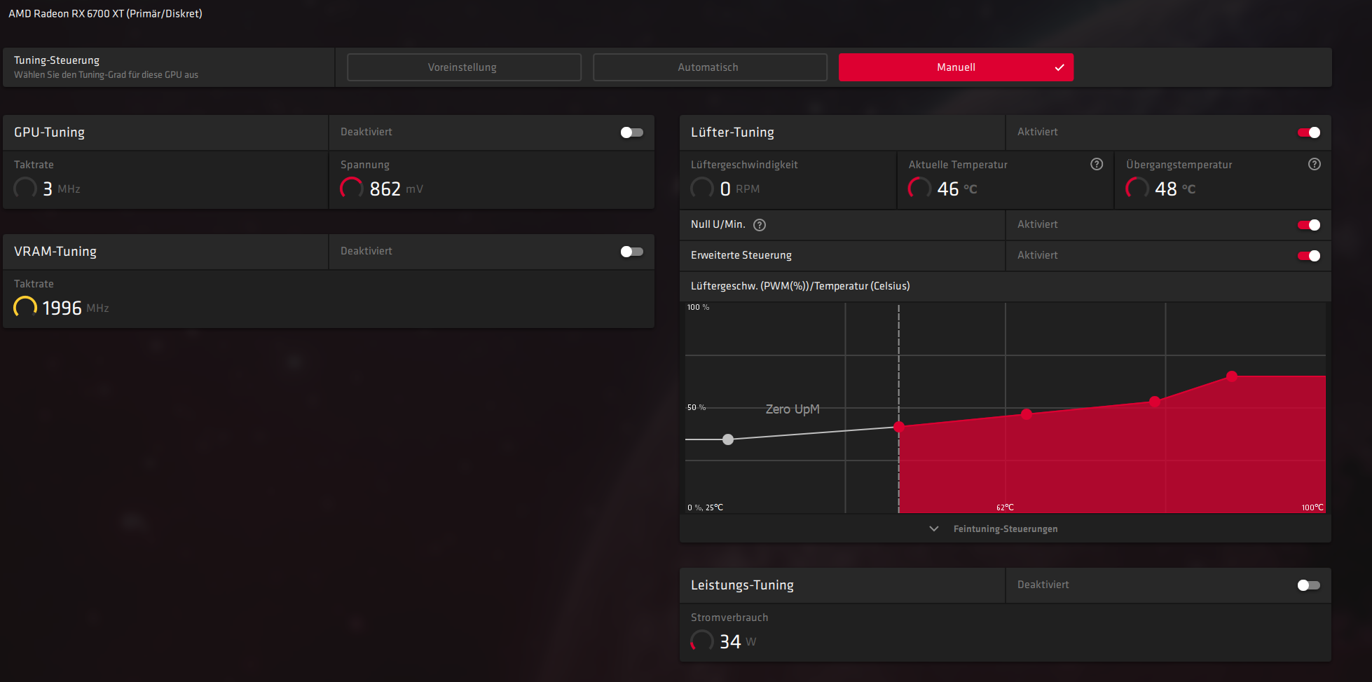 die GPU dreht bei spielen die Lüfter komplett auf, sprich sie wird extrem laut. Einstellungen über die radeon software werden gefühlt komplett ignoriert. Sie bleibt bei ca. 60°C bei voller Auslastung jedoch möchte ich sie leiser haben.