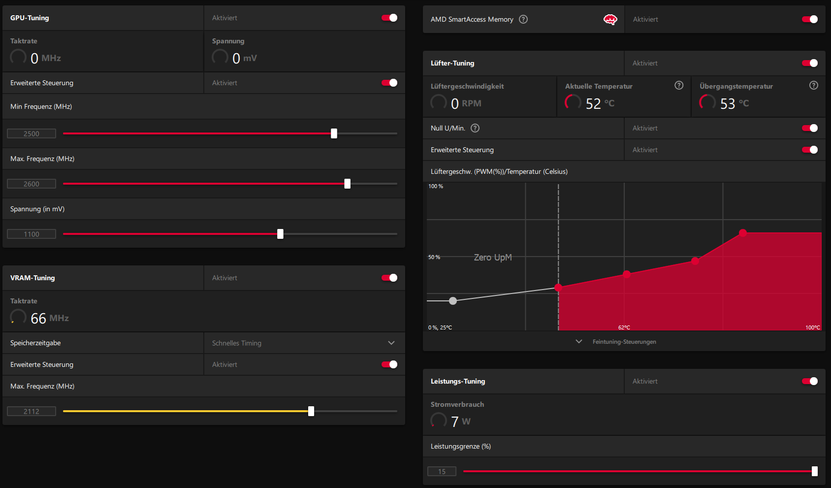 Auch im Energiesenkungs-Modus der AMD Software sinkt die Temperatur kaum.