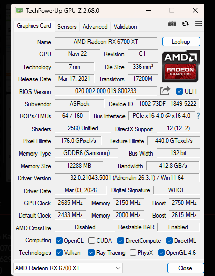 Ryzen 5 7500FCorsair Frame 5000D RS32 GB DDR5 6000[B]ASRock Challanger D RX 6700XT [/B][B]Samsung GDDR6 [/B][B]79% ASIc-Qualität[/B]